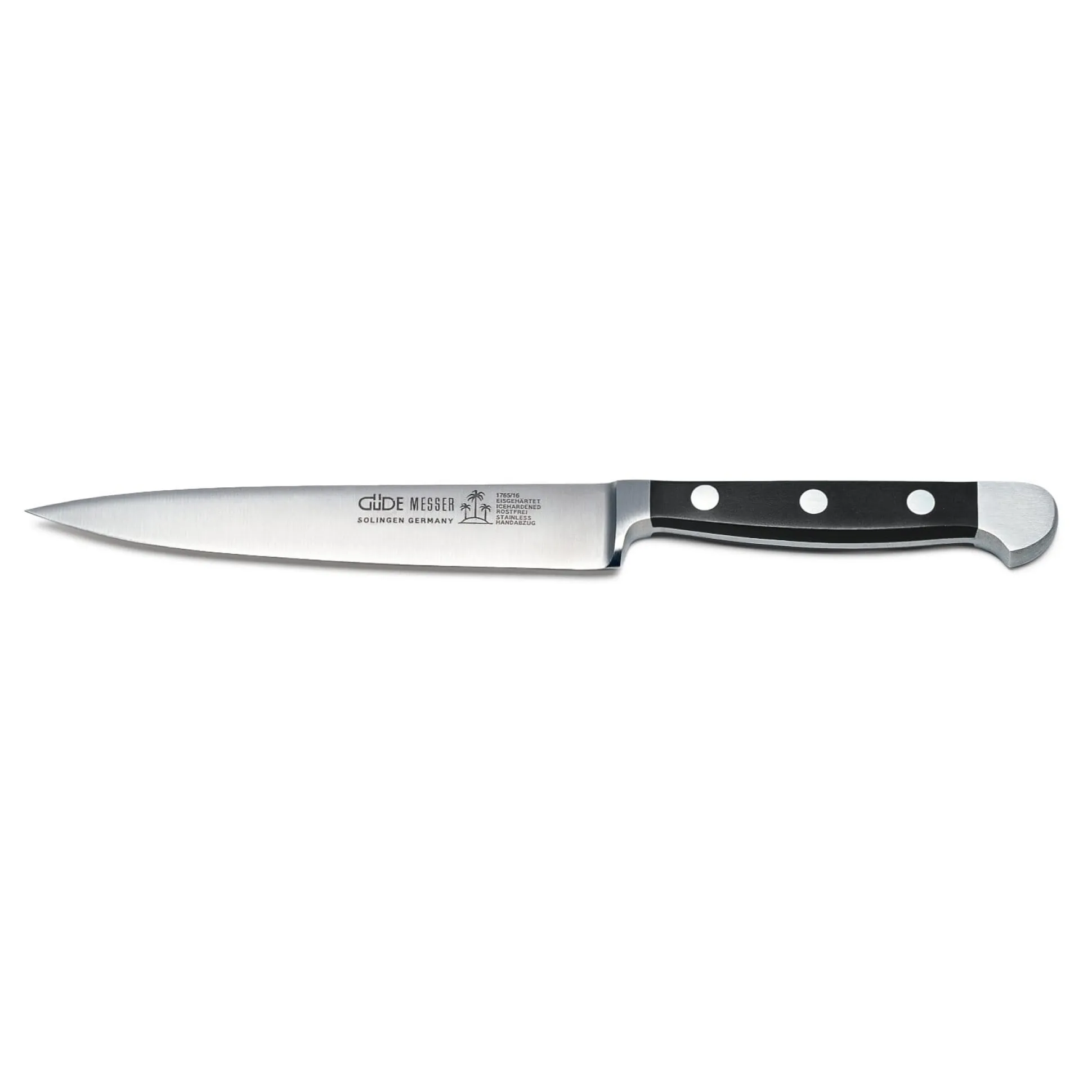 Bei diesem geschmiedeten Messer aus dem 1910 gegründeten Solinger Betrieb von Franz Güde ist am Ende des Griffes ein zweiter Kropf ausgeschmiedet; dieses zusätzliche Gewicht verlagert den Schwerpunkt des Messers nach hinten und gibt ihm damit eine überlegene Balance. Alle Güde-Messer sind aus rostfreiem Messerstahl, eisgehärtet (56 HRC), handabgezogen und handgeschärft. Wir bieten sie in zwei Varianten an: mit Griffschalen aus Pflaumenbaumholz und – wie bei Profimessern aus hygienischen Gründen schon lange üblich – mit solchen aus dem thermoplastischen Kunststoff Polyoxymethylen (POM). Alle Griffschalen sind mit Edelstahlnieten befestigt.