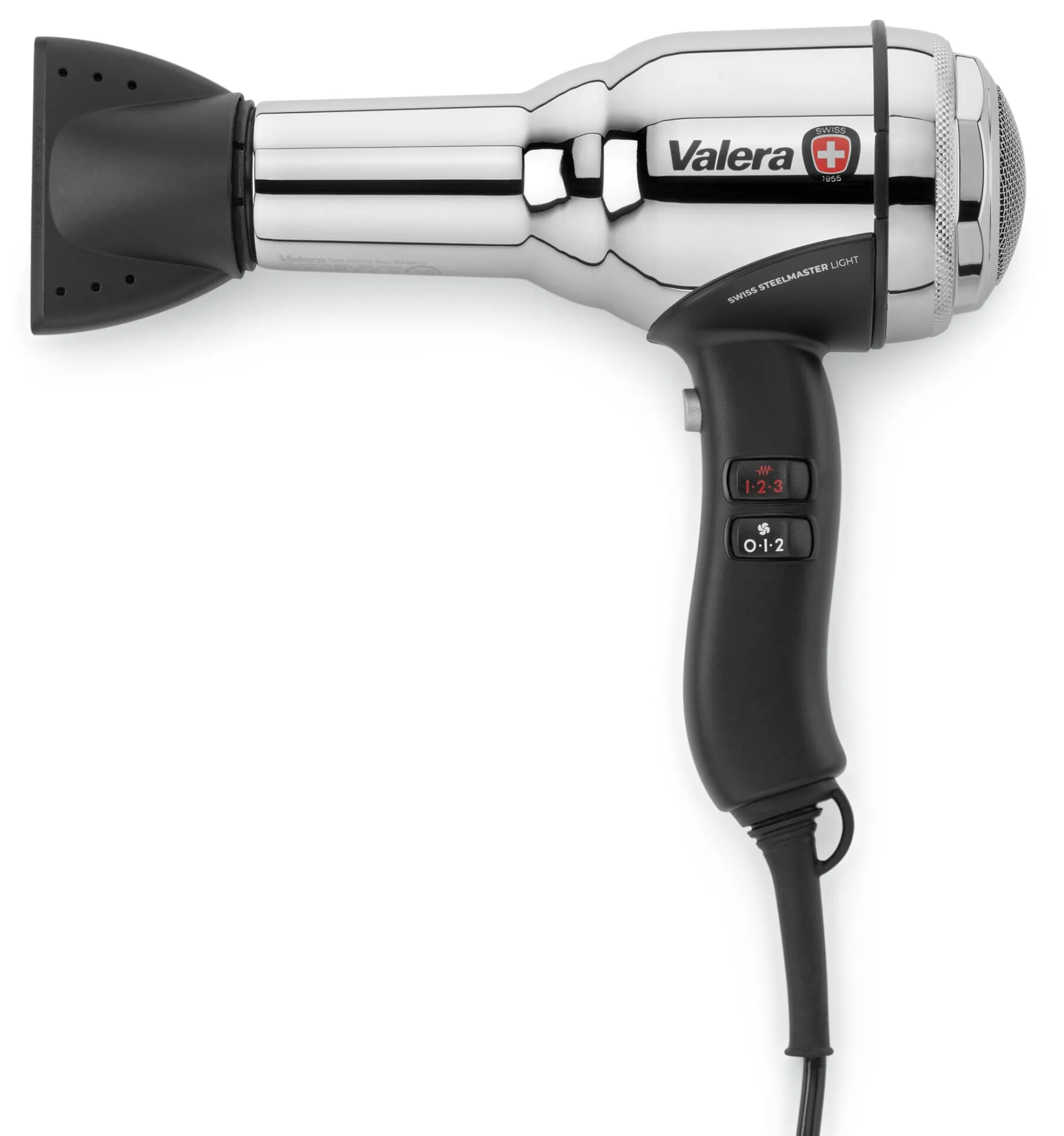 Aus der Schweiz kommt dieser Haartrockner, dessen Hersteller Valera® sich schon seit der Unternehmensgründung im Jahr 1955 ausschließlich auf das Geschäftsfeld der Haarpflege-Geräte beschränkt und dabei eng mit dem professionellen Friseurgewerbe zusammenarbeitet. Im stabilen Metallgehäuse dieses Föhns arbeitet dementsprechend ein langlebiger, leichter PM-Pro-Motor, wie er üblicherweise in leistungsstarken professionellen Geräten zum Einsatz kommt. Der Heizdraht ist nicht spiral-, sondern wellenartig geformt und wird präzise und direkt auf den Träger aus Mikanit – einem klassischen Material, das Temperaturen von 400 bis 500 °C schadlos übersteht – montiert. Dies garantiert eine gleichmäßige Temperaturverteilung und dadurch eine längere Lebensdauer des Heizelementes. Ein in den Haartrockner integrierter Ionengenerator spaltet Moleküle der angesaugten Luft und wandelt sie in negative Ionen um, die mit der gewärmten Luft ins Haar geblasen werden. Dort bewirken sie ein Zerstäuben der Wassertropfen: Ein Teil der Tropfen wird vom Haar aufgenommen, während das restliche Wasser schneller verdunstet. Der Vorteil: Die Haare werden deutlich kürzer mit heißer Luft strapaziert. Zusätzliche turmalinbeschichtete Komponenten verstärken diesen Effekt, da sich das Mineral bei hohen Temperaturen elektrostatisch auflädt und ebenfalls negativ geladene Ionen produziert.