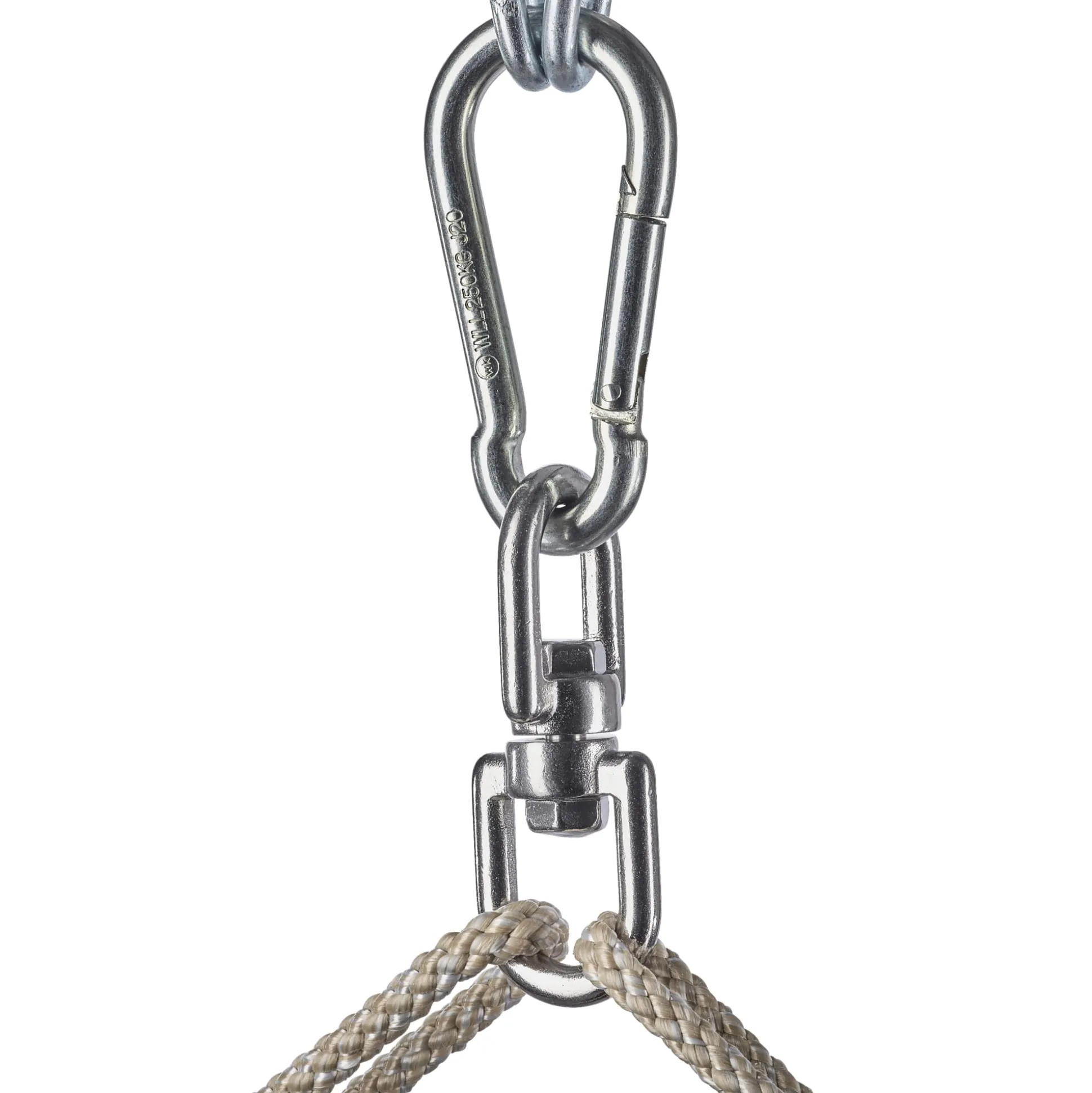 Der Stoff wird in einer speziellen Endloswebtechnik gearbeitet, bei der eine festgelegte Anzahl baumwollener Endlosfäden so miteinander verwoben wird, dass im Gewebe weder störende Knoten noch lose Randfäden auftreten und jeder einzelne Faden mit dem Trägerseil fest verbunden ist. Eine derart gewebte Stoffbahn ist überaus reißfest und sichert eine gleichmäßige Lastenverteilung; ihre Materialopulenz spürt man auf den ersten Griff. Der hölzerne Fixierstab verhindert ein Zusammenrutschen der Matte, der Drehwirbel am Karabinerhaken – die beide aus verzinktem Stahl gefertigt und damit unempfindlich sind – ermöglicht die Höhenanpassung des Hängesessels. Das Tragseil besteht aus gutem Grund aus synthetischem Material. Der österreichische Hersteller setzt hier eine UV- und witterungsbeständige Polyestermischung ein, die abriebsicher ist und eine langfristige Belastbarkeit gewährleistet.