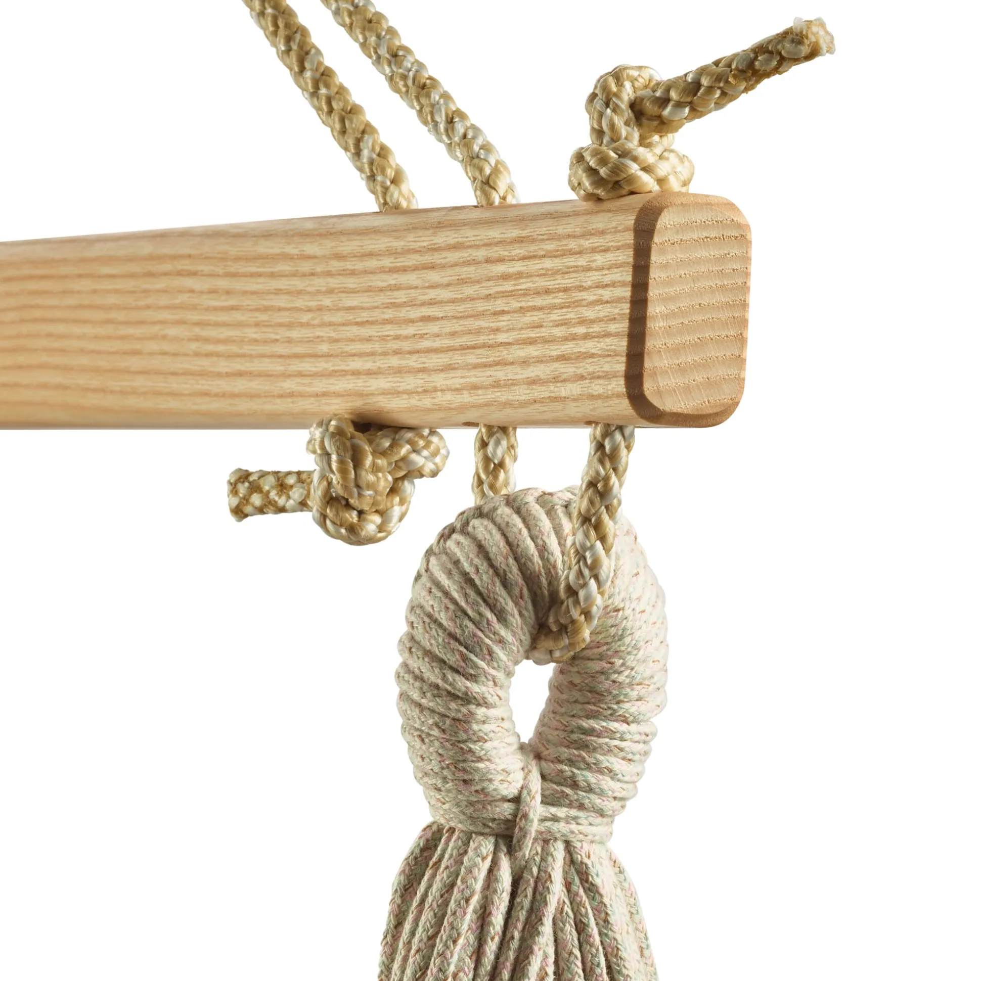 100% Baumwolle, Eschenholz (unbehandelt). Drehwirbel und Karabiner aus galvanisch verzinktem Stahl. Hergestellt in Österreich.