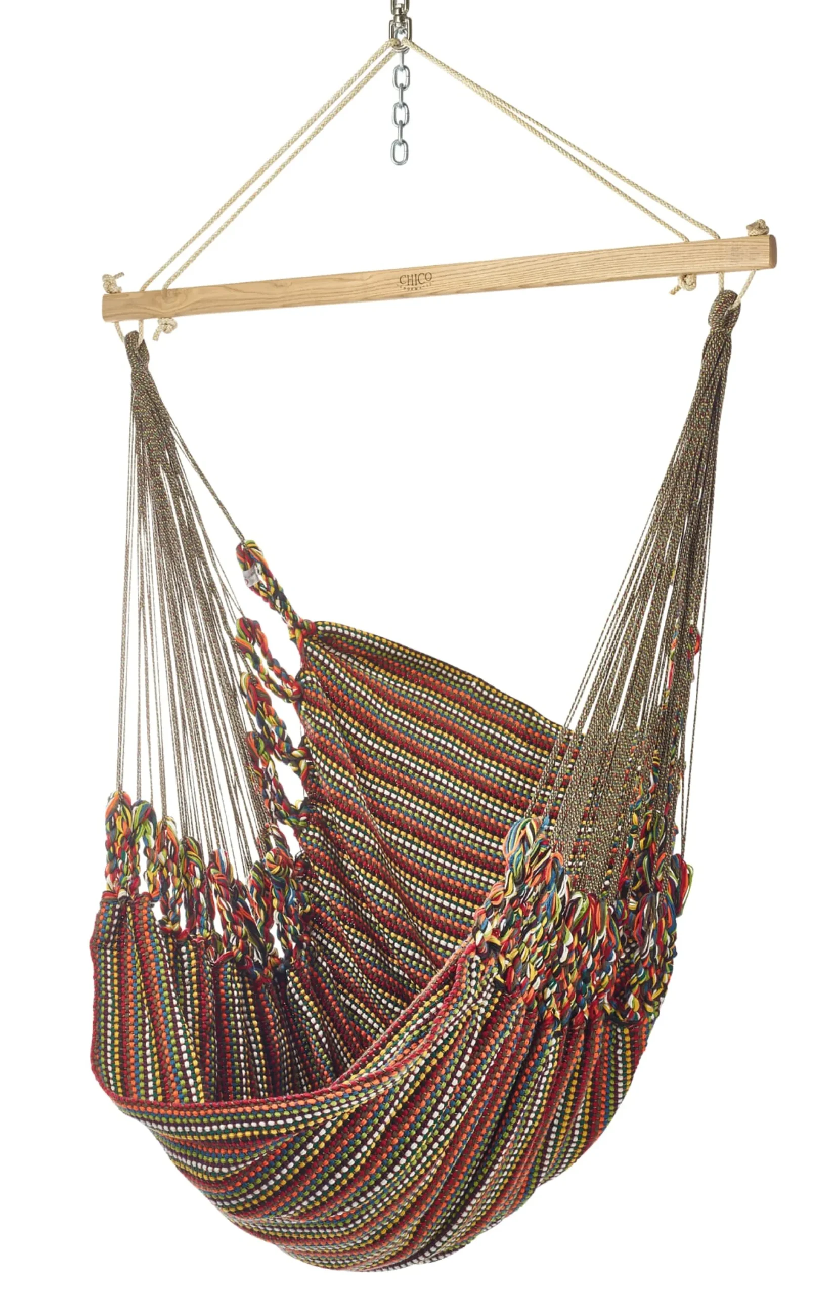 Der Stoff wird in einer speziellen Endloswebtechnik gearbeitet, bei der eine festgelegte Anzahl baumwollener Endlosfäden so miteinander verwoben wird, dass im Gewebe weder störende Knoten noch lose Randfäden auftreten und jeder einzelne Faden mit dem Trägerseil fest verbunden ist. Eine derart gewebte Stoffbahn ist überaus reißfest und sichert eine gleichmäßige Lastenverteilung; ihre Materialopulenz spürt man auf den ersten Griff. Der hölzerne Fixierstab verhindert ein Zusammenrutschen der Matte, der Drehwirbel am Karabinerhaken – die beide aus verzinktem Stahl gefertigt und damit unempfindlich sind – ermöglicht die Höhenanpassung des Hängesessels. Das Tragseil besteht aus gutem Grund aus synthetischem Material. Der österreichische Hersteller setzt hier eine UV- und witterungsbeständige Polyestermischung ein, die abriebsicher ist und eine langfristige Belastbarkeit gewährleistet.