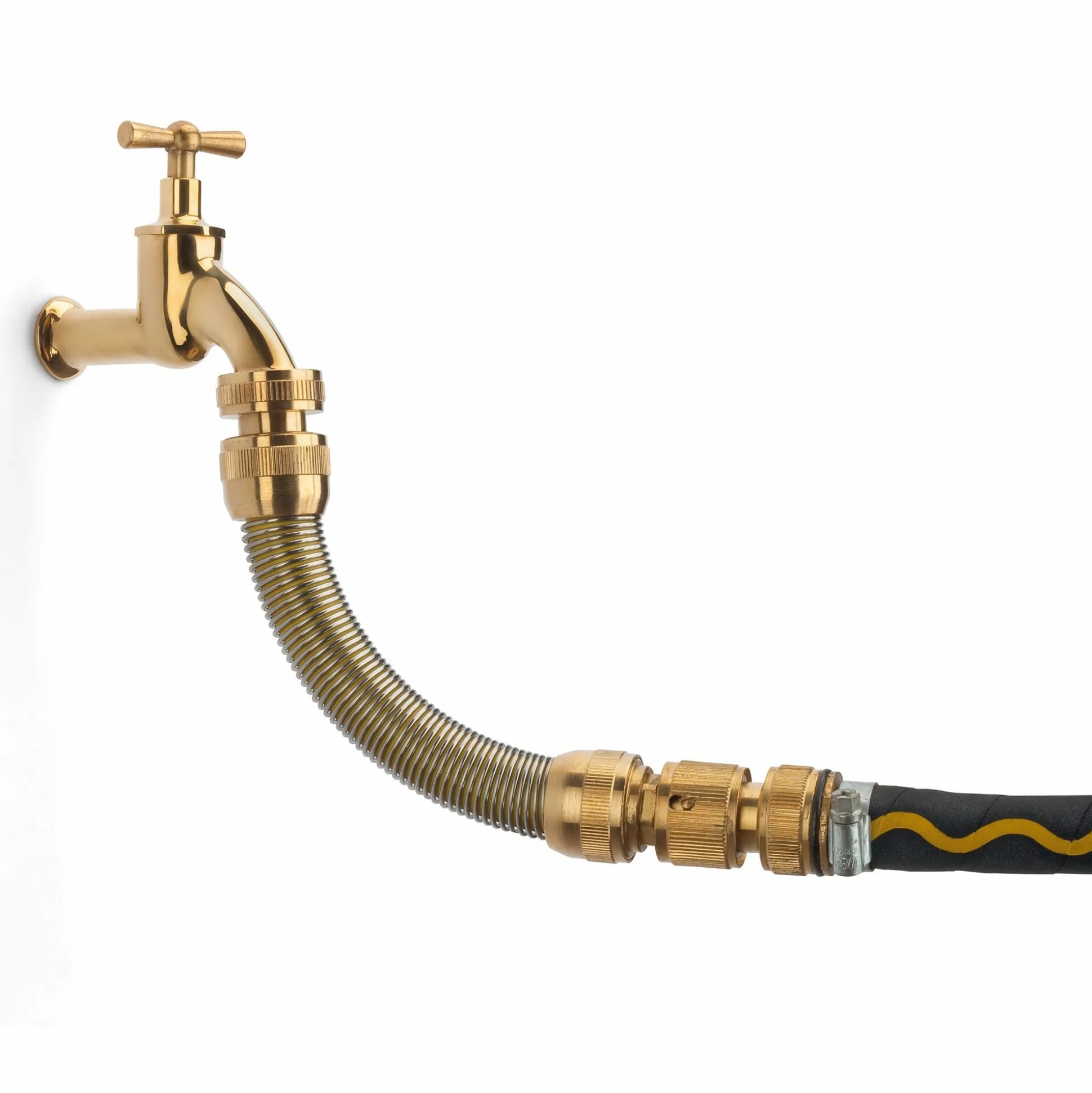 Biegsames Verbindungsstück zwischen Gartenschlauch und Hahnanschluss. Die stabile Spirale fängt jede Schlauchbewegung auf und verhindert als eine Art „Puffer“, dass ersterer abknickt oder sich bei ruckartigem Ziehen und Zerren am anderen Ende dauerhaft verdreht.