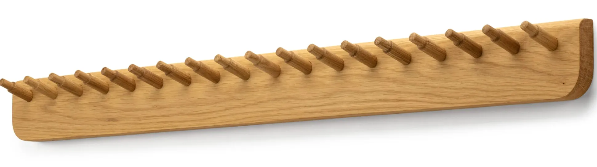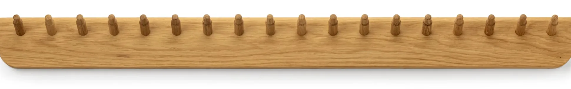 Eine Hakenleiste aus massivem, geöltem Eichenholz, die nicht nur ansehnlich ist, sondern vor allem zuverlässig übernimmt, was Sie gerade hängen lassen möchten. Und dies in außerordentlicher Menge, denn dank zahlreicher Haken ist sie in kleineren wie größeren Wohn- und Lebensverhältnissen von umfassendem Nutzen, in der Ausführung mit 18 Haken wird sie selbst einer Großfamilie inklusive Gästeschar dienlich sein. Mit ihrer geradlinig-dezenten Gestaltung fügt sich die Hakenleiste harmonisch in Flur oder Küche, Bad oder Schlafzimmer ein. Ein kleines, feines Detail: Die aufwärts gerichteten Haken sind im vorderen Viertel etwas schmaler gedrechselt. So können Sie vor allem leichtere Textilien, die eine Schlaufe besitzen, zeitweilig in größerem Abstand zur Wand aufhängen – gut für feuchte Hand- und Küchentücher oder verschwitzte Sportwäsche, die Sie zunächst ein wenig lüften lassen möchten.