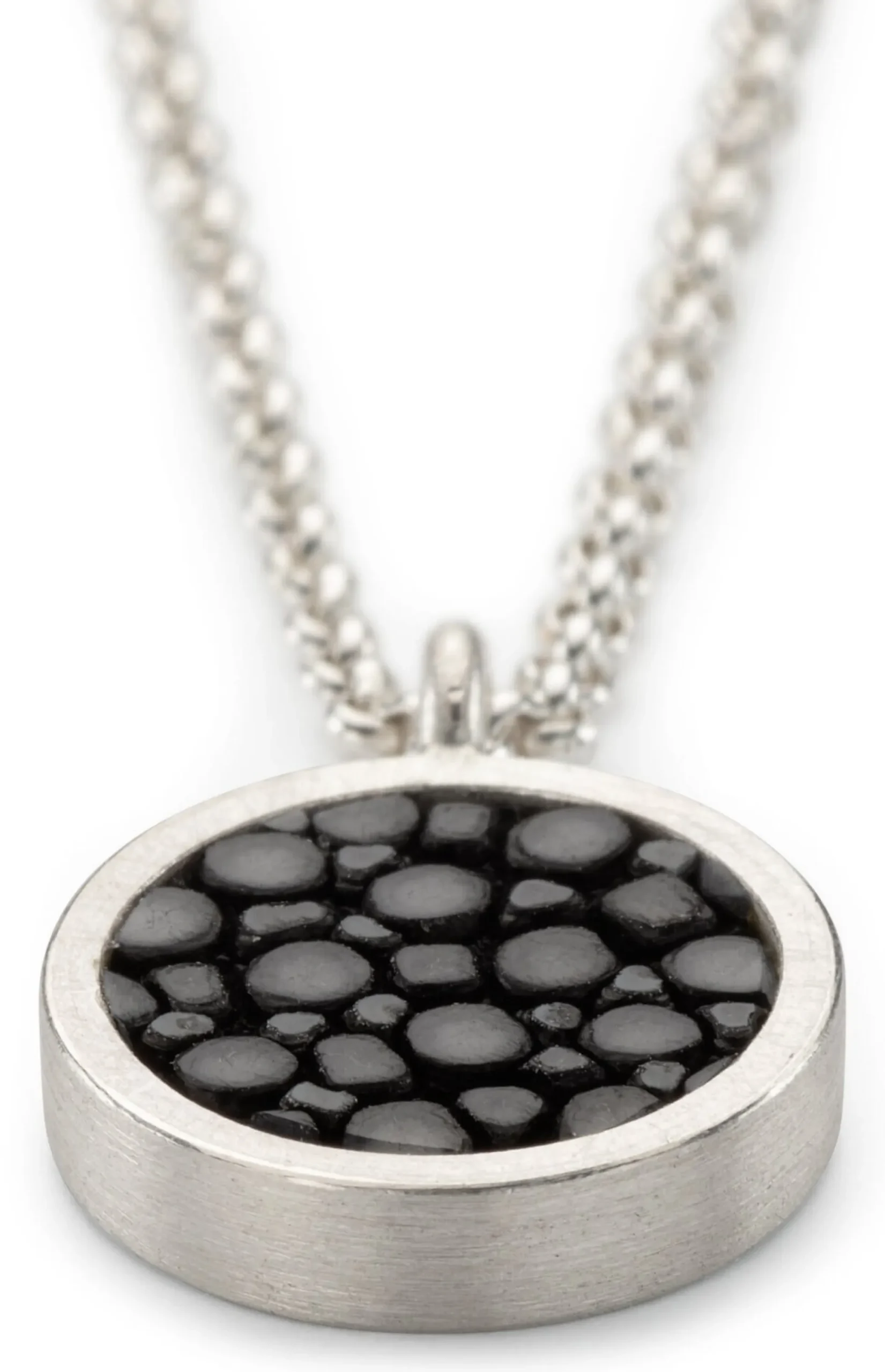 Rochenleder eignet sich besonders gut zur Verwendung in Schmuck. Die Rochenhaut ist von Natur aus übersät mit vielen kleinen Hornkügelchen, die geschliffen und poliert werden können, was dem Leder eine fast edelsteinartige Optik gibt. Ramona Stelzer kombiniert für den Anhänger dieser Halskette tiefschwarz gefärbtes Rochenleder mit gebürstetem 925er Silber. Die filigrane Kette ist ebenfalls aus 925er Silber gearbeitet.