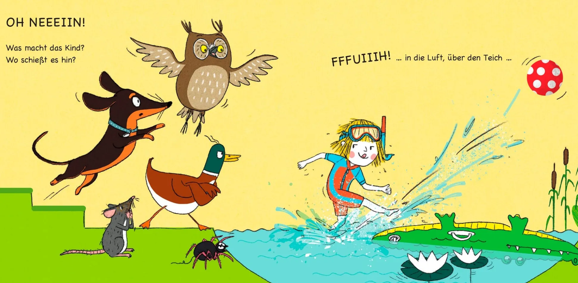 Alle wollen mit dem Ball spielen – doch wo fliegt er hin? Vorlese-Spaß: lustige Tiergeschichte mit Lautmalereien.