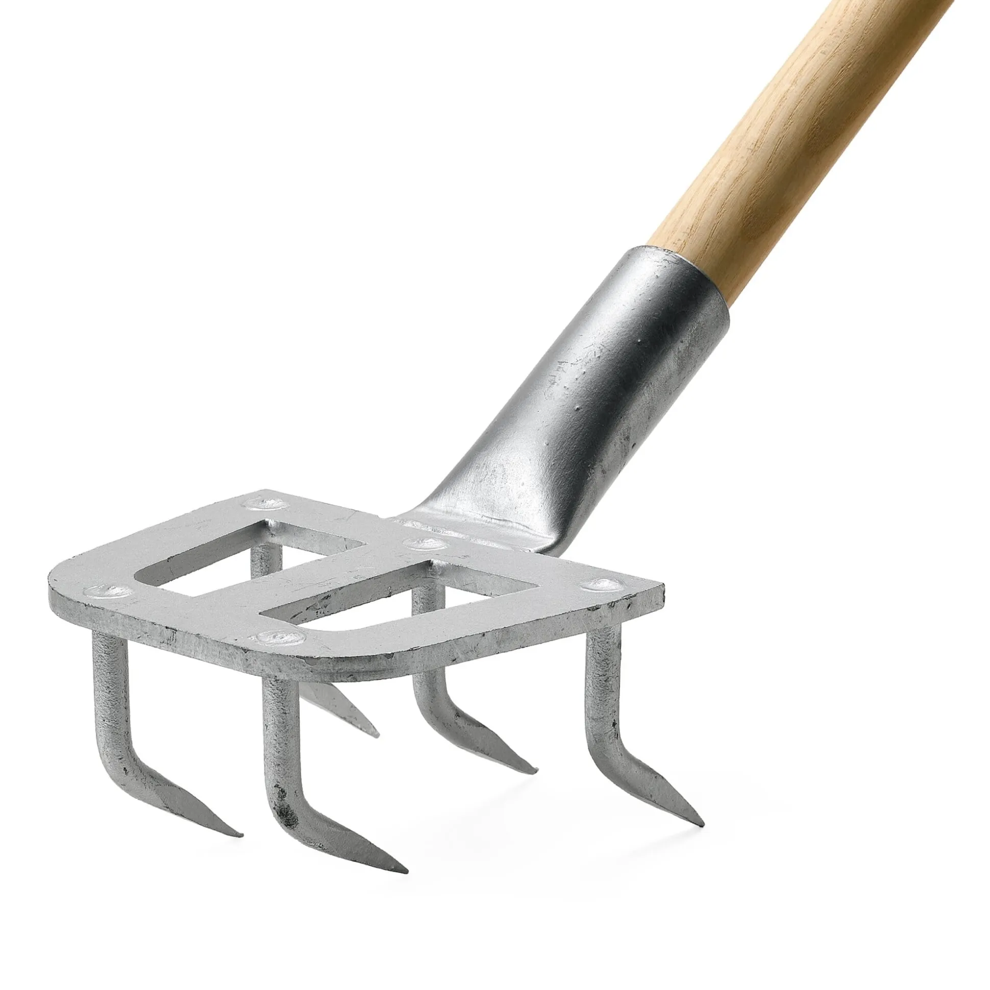 Ein im Gebrauch zur Bodenlockerung und bei der Unkrautbekämpfung phantastisches Gerät: Die Stieltülle setzt in einem unüblichen, aber genau berechneten Winkel so an, dass die beiden Zinkenreihen bei normaler Arbeitsstellung des Stiels senkrecht auf den Boden treffen und ihn – tatsächlich in der Arbeitsweise einer Egge – erstaunlich gründlich durcharbeiten. Das Werkzeug ist eine Sonderanfertigung für Berufsgärtner.