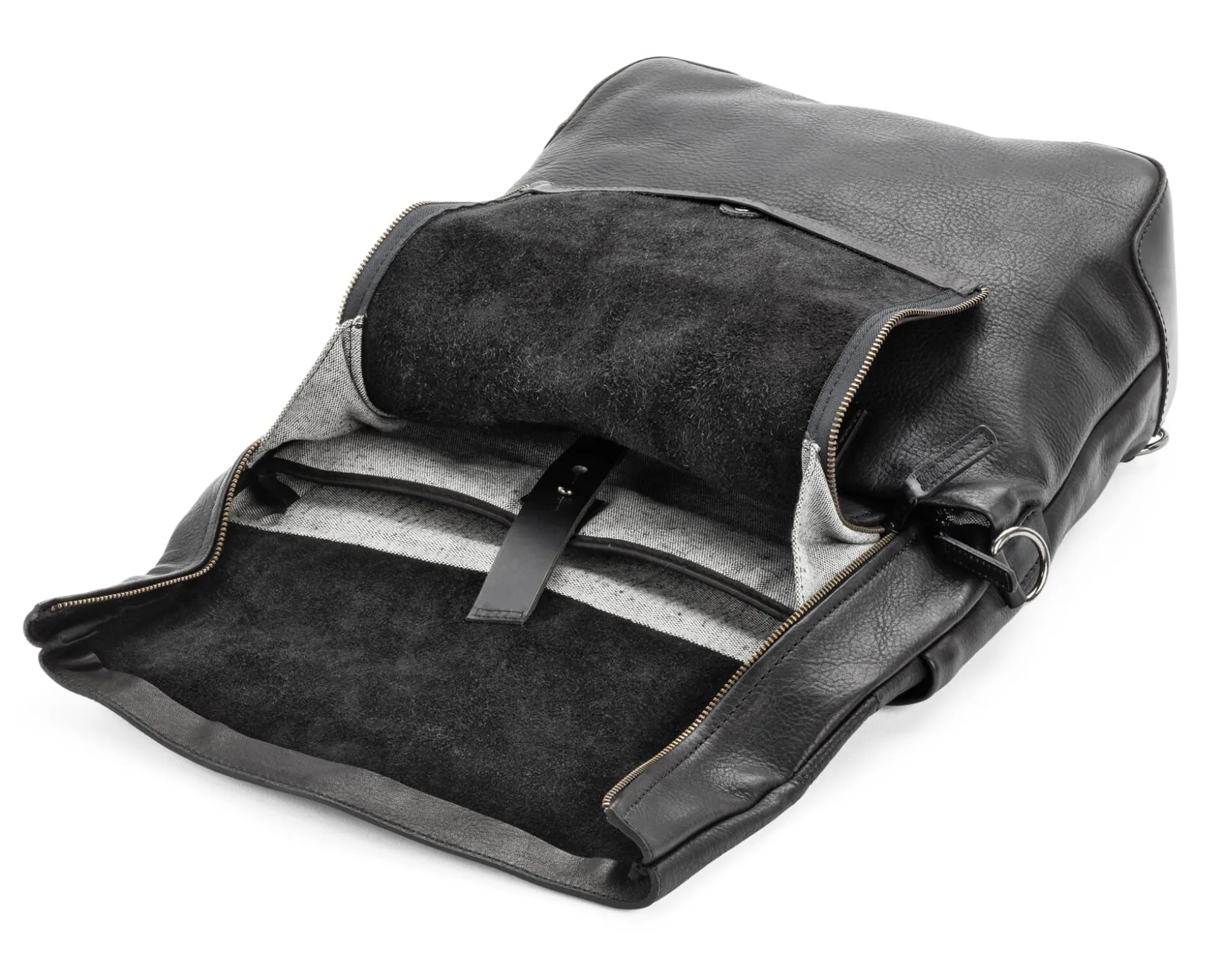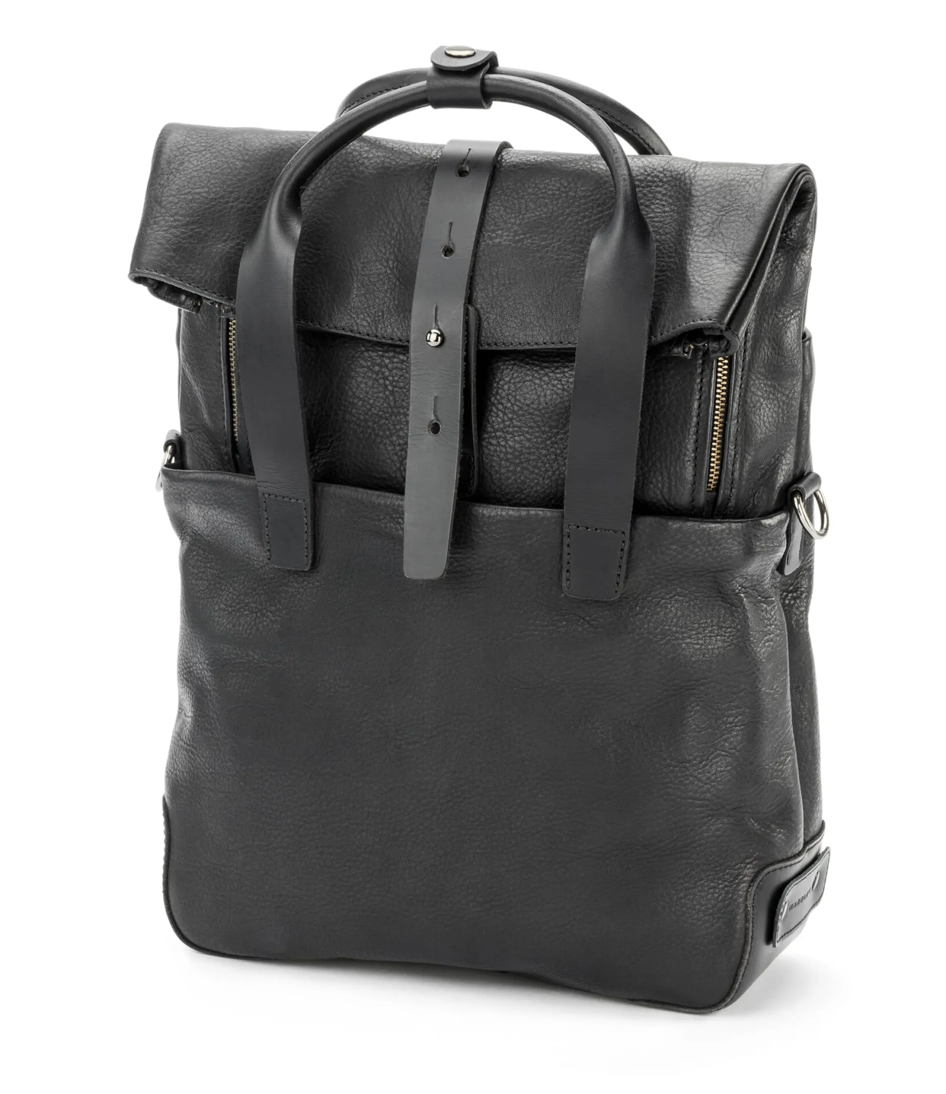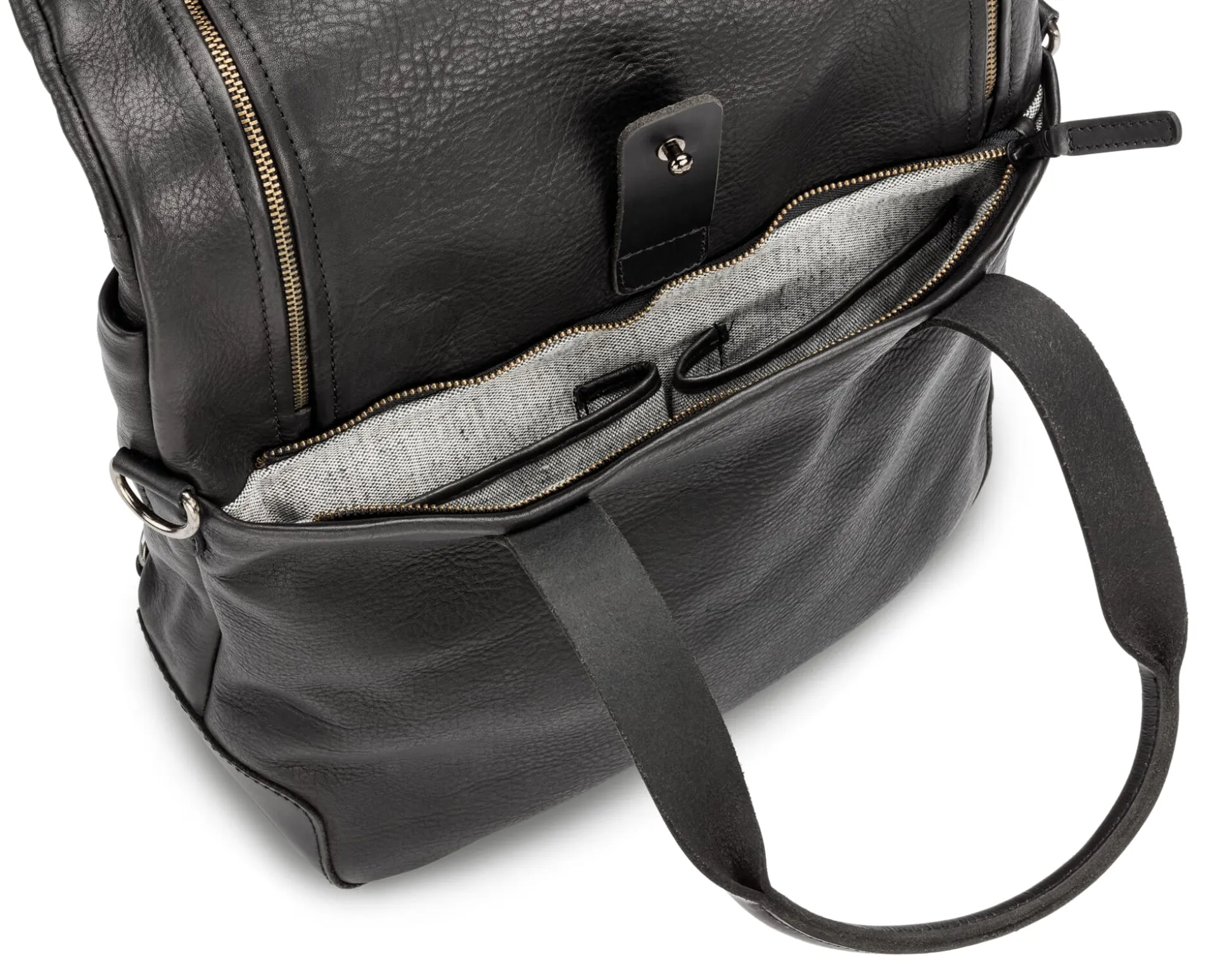 Diese Tasche aus samtig-griffigem, gewachstem Rindleder kann sowohl als Rucksack wie auch über der Schulter oder an den Handgriffen getragen werden. Mit ihrer außergewöhnlichen, gleichzeitig sachlich-funktionalen Gestaltung und einem gepolsterten Laptop-Fach im Inneren wird sie zur perfekten Business-Tasche und ist überdies für jedes Transportmittel, insbesondere auch für kurze Fahrradstrecken, tauglich. Dafür kann der zusätzliche Baumwollgurt mittels Karabiner angebracht und als Schulterriemen crossbody gelegt werden. Zudem ist das Volumen dank des Umschlags variabel, wobei sich die Tasche auch bei maximaler Befüllung noch schließen lässt. Für ein bequemes „Be- und Entladen“ des Rucksacks ist der Überschlag mit zwei Reißverschlüssen versehen, mit denen die Öffnung vergrößert werden kann. Sattlerleder-Riemen mit Patronentaschenverschluss schließen Haupt- und Laptop-Fach. Innen ist die Tasche mit einem graumelierten Futterstoff ausgeschlagen, der zu gleichen Teilen aus Baumwolle und aus recyceltem PET besteht. Außen auf der Rückseite verfügt der Rucksack über ein breites Reißverschlussfach und ein kleineres an der Vorderseite, in das zwei kleine Steckfächer integriert sind.