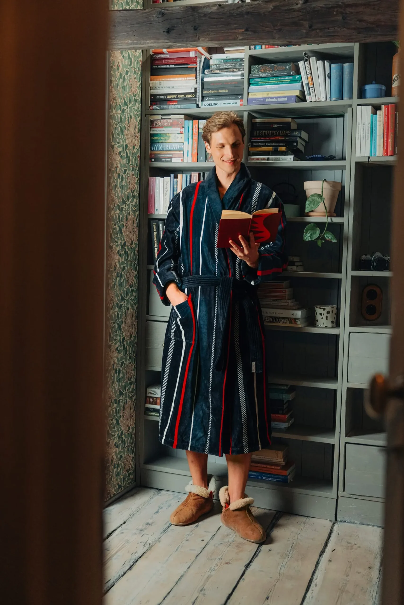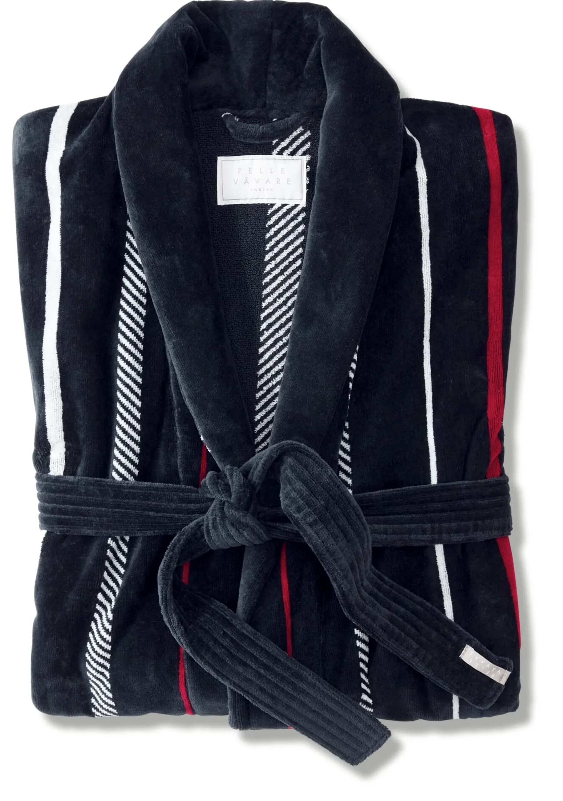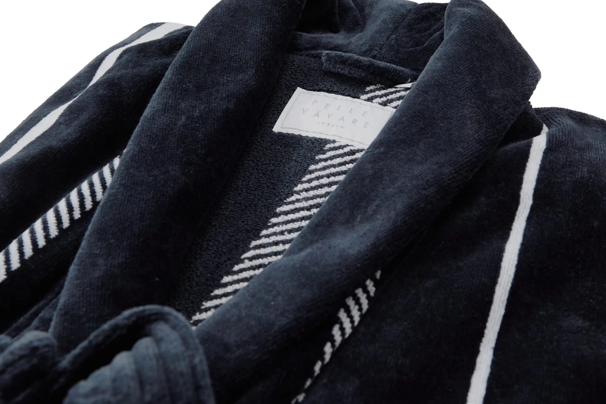 Dieser Hausmantel entsteht aus einem in aufwendiger Webtechnik hergestellten Gewebe, das auf der einen Seite aus kuschelig-weichem Velours und auf der anderen Seite aus saugfähigem Frottier besteht. Für den Velours auf der Außenseite des Bademantels werden die im Grundgewebe verankerten Schussfäden aufgeschnitten und zu voluminösem Velours „geschoren“. Die Schlingen des Frottiergewebes auf der Innenseite des Mantels sorgen für eine vergrößerte Oberfläche und dadurch für größere Saugkraft. So entsteht ein 450 g/qm schwerer Stoff, aus dem in Portugal dieser bequeme und kuschelige Haus- und Bademantel konfektioniert wird. Und dank der üppigen Qualität sind Sie damit nicht nur im Haus, sondern auch für einen kurzen Gang in den Garten oder zum Briefkasten bestens angezogen. Der Haus- und Bademantel ist mit zwei aufgesetzten Taschen, einem Schalkragen und gestepptem Bindegürtel versehen.