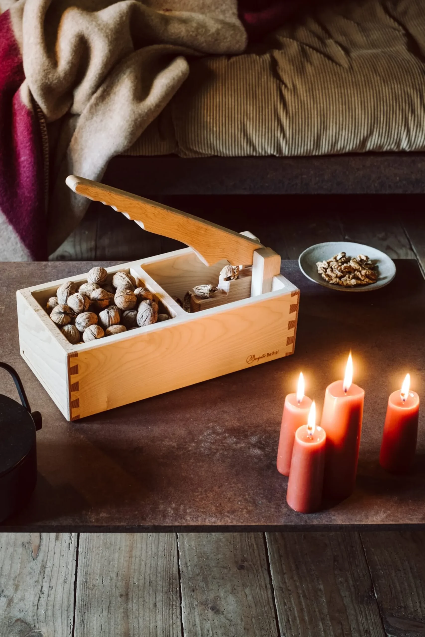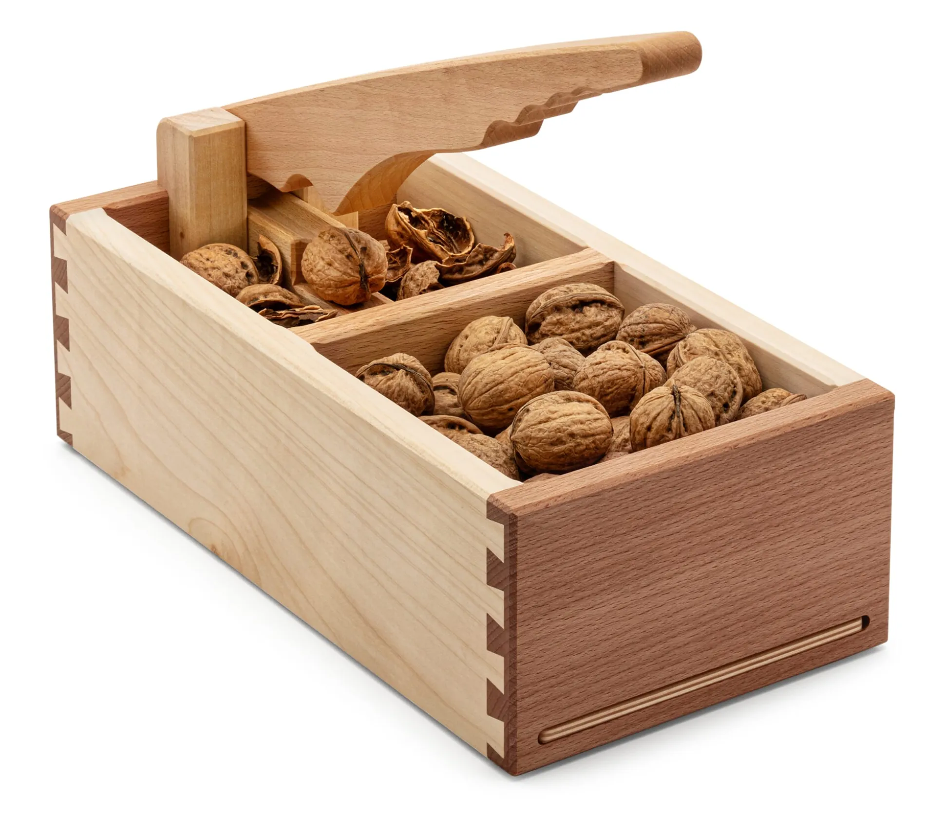 Aus gedämpftem und geöltem Buchenholz. Seitenwände Ahornholz geölt. Bodenplatte Birkensperrholz geölt. Drehgelenk aus Stahl. Höhe 15 cm, Länge 34 cm, Breite 17 cm. Gewicht 1,7 kg. Nicht für Mandeln oder Pecannüsse.
