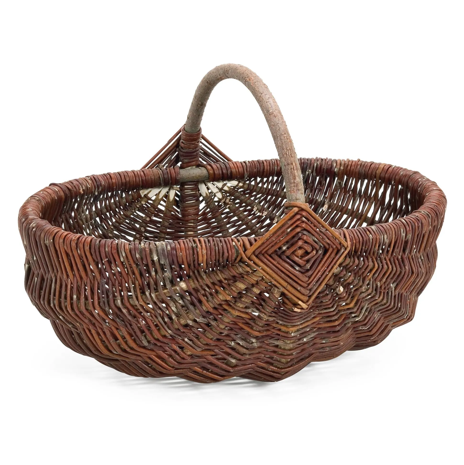 Vielseitig verwendbare Henkelkörbe für verschiedenste Einsatzzwecke: als Einkaufskorb, zum Ernten und Transportieren im Garten, zum Pilzesammeln und vielem mehr. Eine Besonderheit dieser in Handarbeit gefertigten Körbe ist das „Gottesauge“: eine aufwendige Flechttechnik, die den Henkel auf sehr schöne und haltbare Art mit dem Korpus verbindet.
