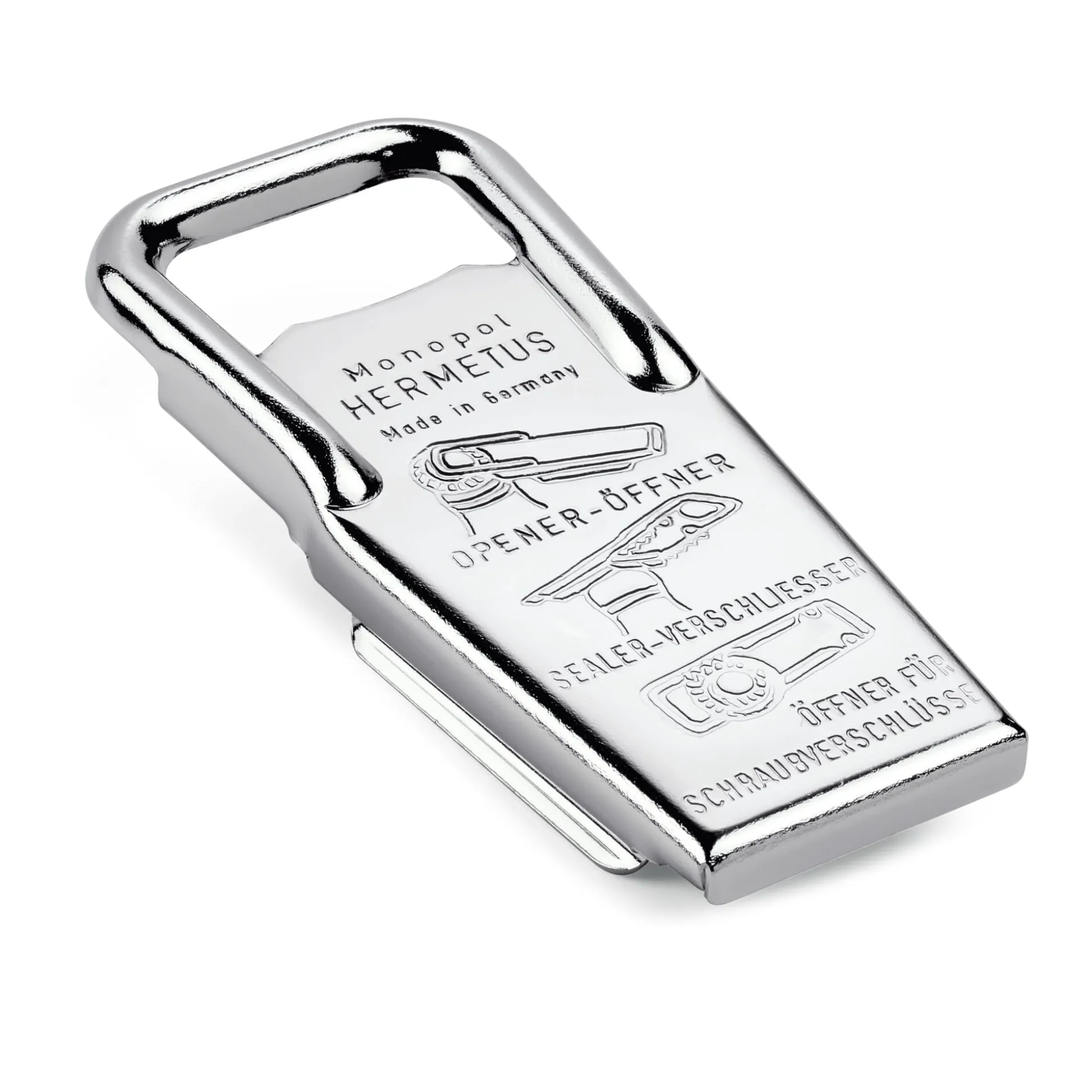 Sein Name ist Programm: Der „Hermetus“, der auch als klassischer Flaschenöffner zu gebrauchen ist, verschließt einmal geöffnete Kronkorken-Flaschen luftdicht – geöffnete Getränke bleiben mit seiner Hilfe länger spritzig und frisch. Und nicht etwa nur Kronkorken lassen sich mit seiner Hilfe lösen, sondern auch Schraubdeckel – sein kurzer Hebel ermöglicht eine effektivere Kraftübertragung.
