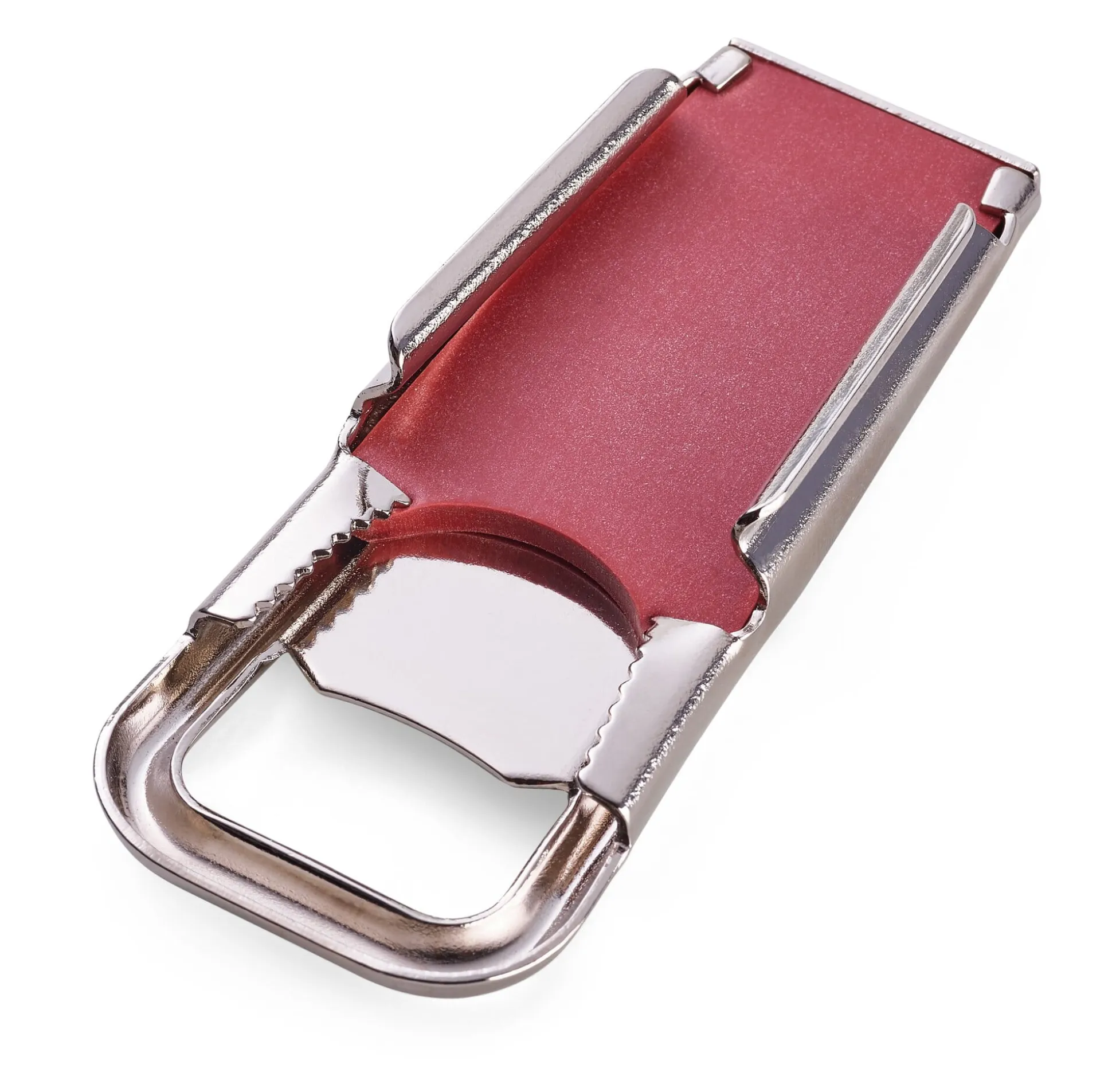 Bandstahl vernickelt. Dichtfläche aus rotem Silikon. Länge 8,5 cm, Breite 3,5 cm. Gewicht 35 g. Funktionsbeschreibung auf der Oberseite.