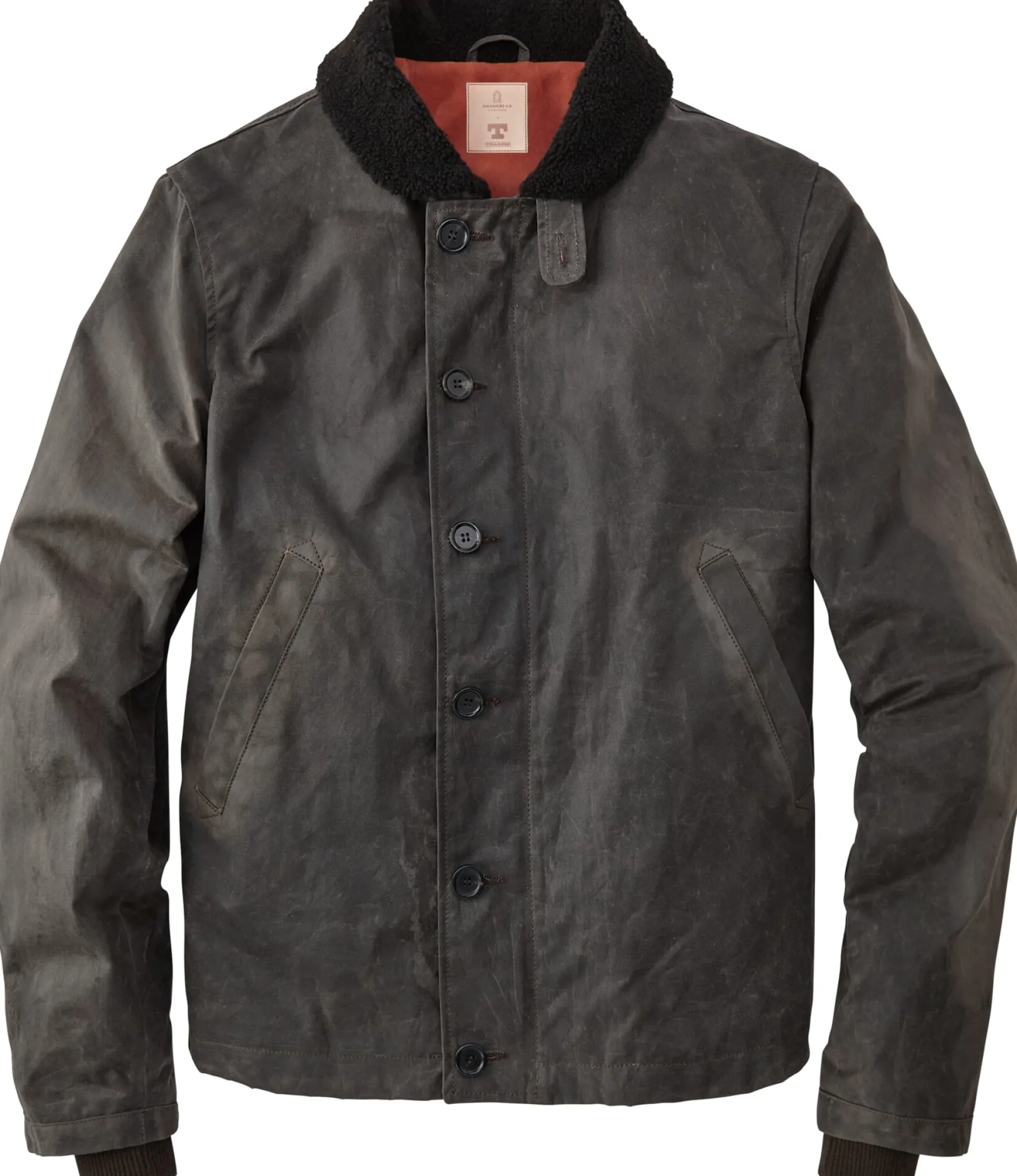 Auf See herrschen oft ungemütliche Bedingungen. Kein Wunder also, dass die Bekleidung dort entsprechend robust sein muss . Um auf den ungeschützten Schiffsdecks der Witterung trotzen zu können, besteht der Oberstoff dieses Deckjackets aus dicht gewebtem und gewachstem 12-oz-Baumwollcanvas mit kernigem Griff, darunter liegt ein wärmendes Rumpffutter aus Moleskin. Ärmelfutter aus Viskose erleichtern das An- und Ausziehen. Geschlossen wird das Deckjacket mit einem Metallreißverschluss, über dem eine geknöpfte, windabweisende Blende liegt. Innenliegende Rippenstrickbündchen an den Ärmeln halten auch dort den Wind ab. Der Lammfellkragen hält Hals und Nacken warm. Das Deckjacket ist mit zwei Einschubtaschen sowie einer Innentasche ausgestattet.
