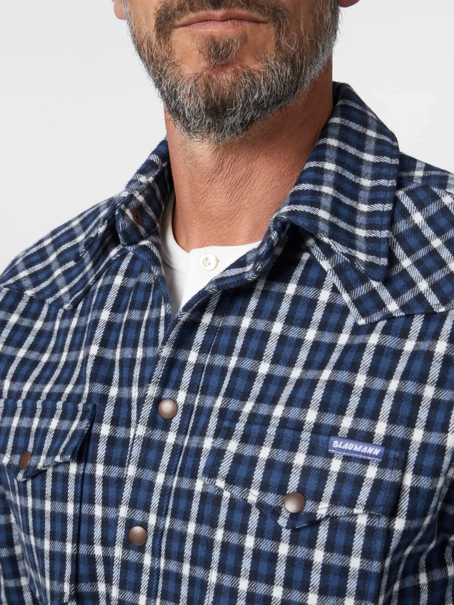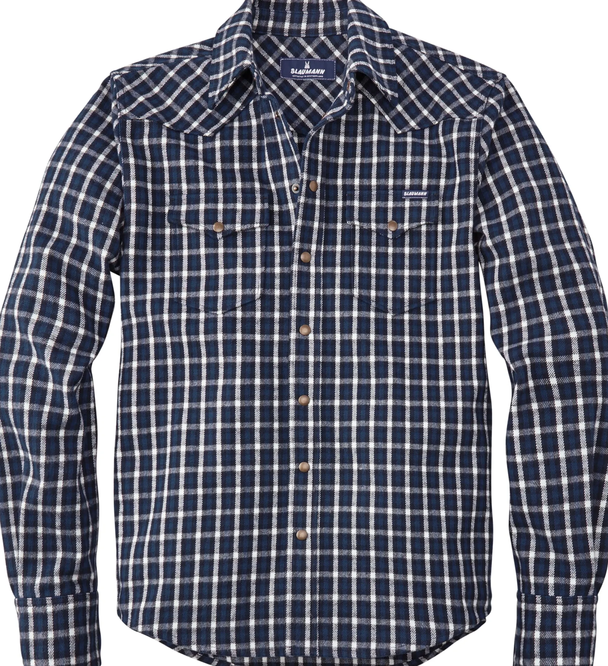 Ein gewichtiger weicher Baumwollflanell ist der Stoff, aus dem dieses Hemd gemacht ist. Passend zur markanten Haptik zeigt er ein farbkräftiges, blau-weißes Karomuster, das in Teilen einen deutlich sichtbaren Köpergrat zeigt. Geschlossen wird das Hemd mit kupferfarbenen Metalldruckknöpfen, zwei mustergetreu aufgesetzte Brusttaschen mit geknöpften Patten nehmen Kleinteile des täglichen Bedarfs auf.