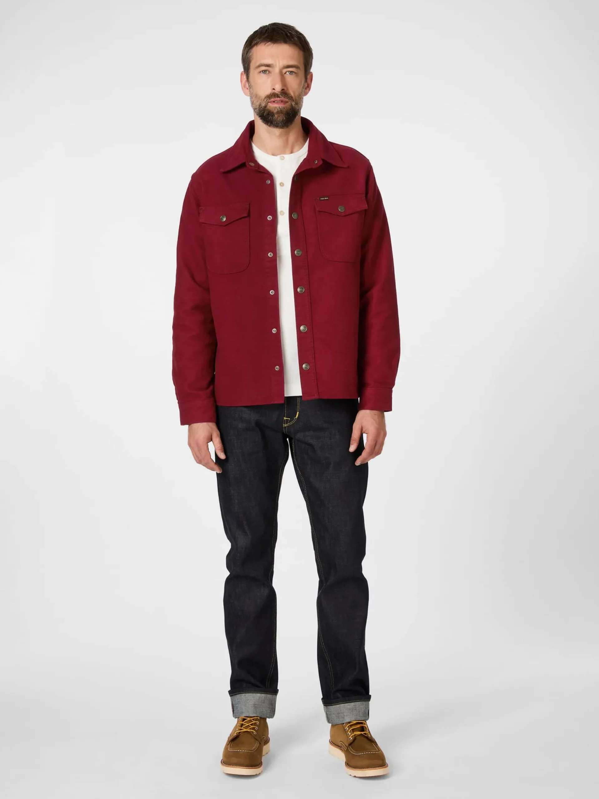 Vorbild dieser Hemdjacke ist ein klassisches Deckshemd der US-Navy, das ursprünglich bei Kälte als Zwischenschicht über der normalen Kleidung und unter der Decksjacke getragen wurde. Entsprechend großzügig ist sie geschnitten. In dieser Ausführung wird sie aus schwerem Moleskin konfektioniert. Dieser ist dicht gewebt, geschmirgelt und angeraut, was ihn unnachahmlich weich und griffig macht. So bietet die Hemdjacke auch als Solitär getragen Wärme und trotzt Wind und Wetter. Sie wird mit markanten Metalldruckknöpfen geschlossen und ist mit zwei Pattentaschen auf der Brust sowie geknöpften Manschetten ausgestattet.