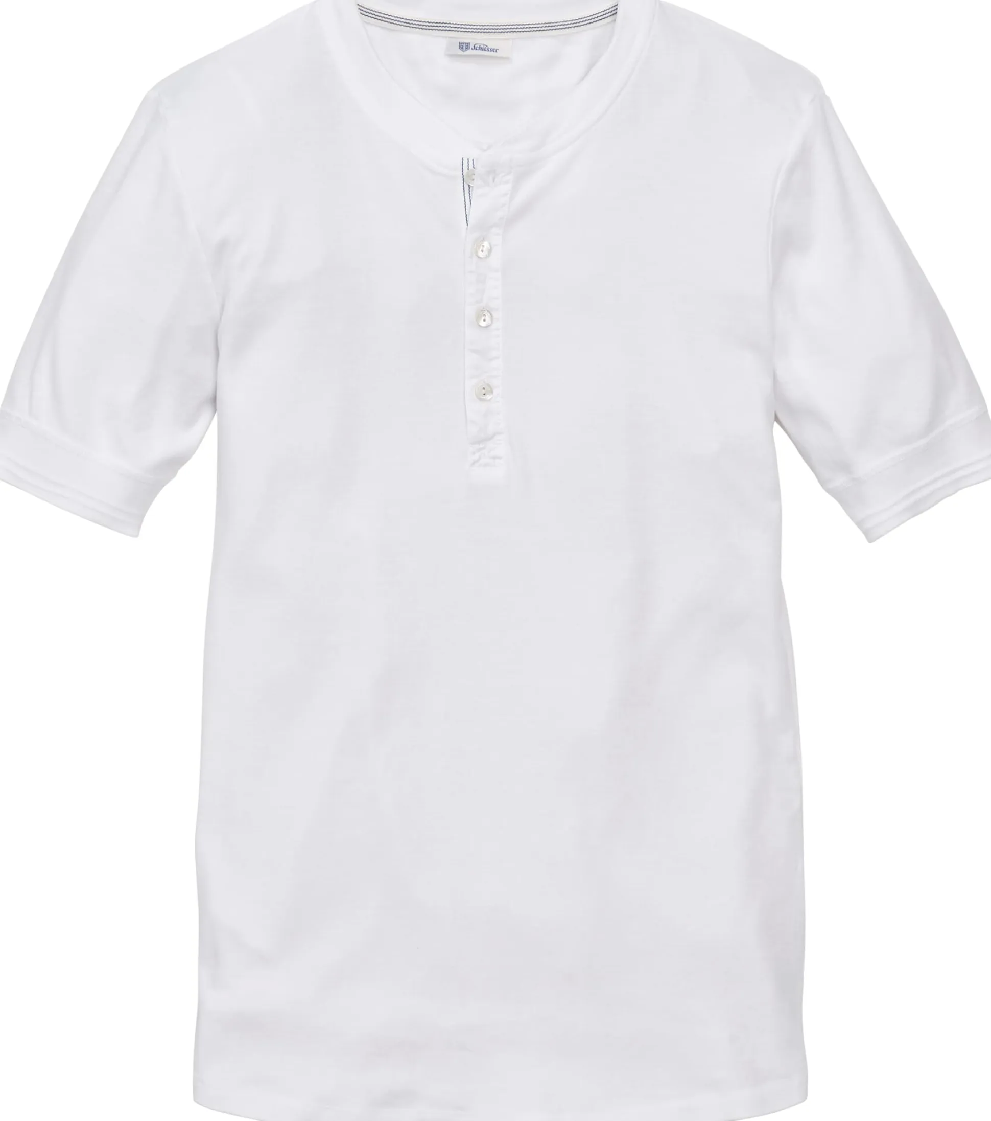 Die Rechts/Rechts-Maschenware für diese als Henley-Shirts bekannten Knopfleistenhemden entsteht auf alten Strickmaschinen. Die angesetzte Knopfleiste ist mit gestreiften Jacquardbändchen verstärkt. Bei dem Unterhemd, das sich auch als T-Shirt zur Jeans tragen lässt, sorgt ein schmaler Kragen mit abgekettelter Außenkante aus Feinripp für guten Schluss am Hals, die Ärmel werden von flach angesetzten Rippenbündchen abgeschlossen. Die Nackenpartie ist mit einem Baumwollbesatz untersteppt.