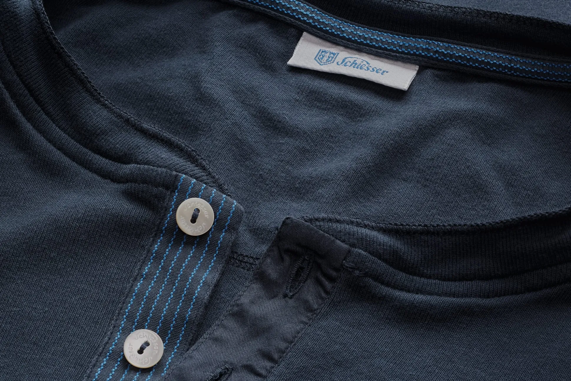Die Rechts/Rechts-Maschenware für diese als Henley-Shirts bekannten Knopfleistenhemden entsteht auf alten Strickmaschinen. Die angesetzte Knopfleiste ist mit gestreiften Jacquardbändchen verstärkt. Bei dem Unterhemd, das sich auch als T-Shirt zur Jeans tragen lässt, sorgt ein schmaler Kragen mit abgekettelter Außenkante aus Feinripp für guten Schluss am Hals, die Ärmel werden von flach angesetzten Rippenbündchen abgeschlossen. Die Nackenpartie ist mit einem Baumwollbesatz untersteppt.
