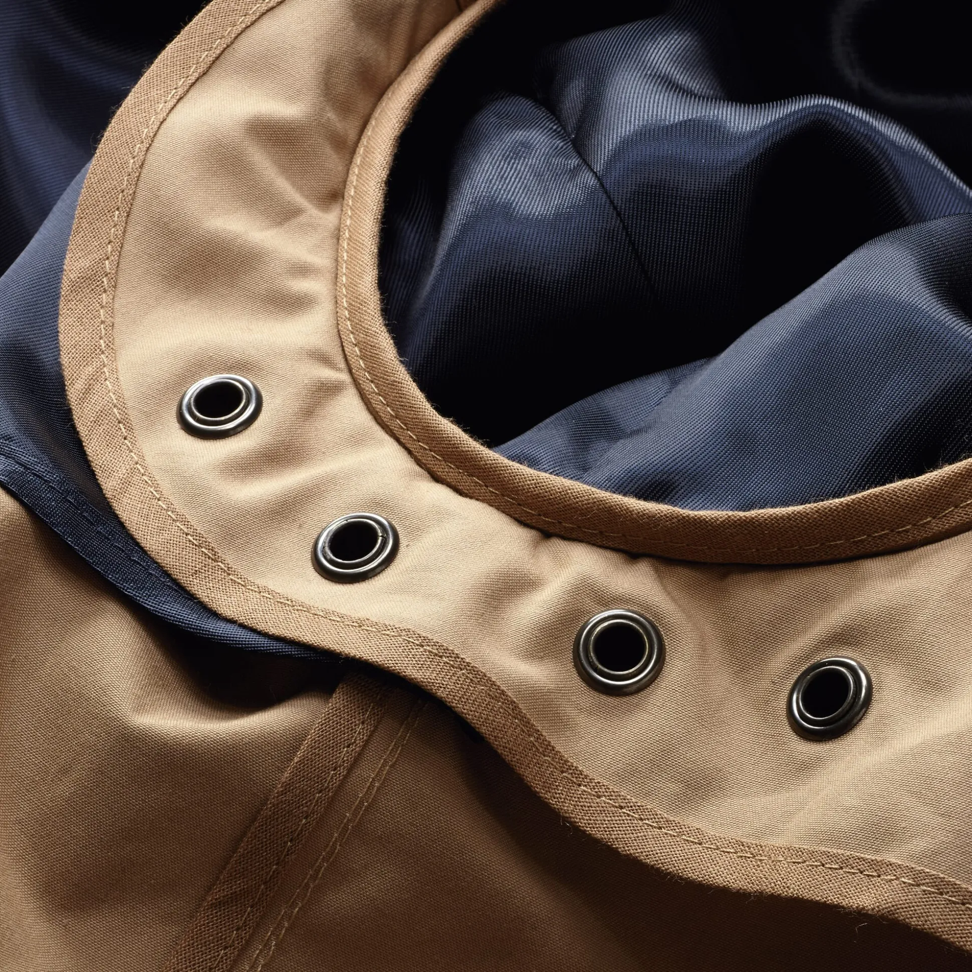 EtaProof® ist ein atmungsaktives Baumwolltuch der Zürcher Weberei Stotz, das nach dem Schutzprinzip der Schirmseide trocken hält, wenn der Regen nicht gerade in Sturzbächen vom Himmel kommt. Der moderat auf Wachsbasis imprägnierte Stoff ist so dicht gewebt, dass die Fasern bei Kontakt mit Feuchtigkeit aufquellen und Wassertropfen an der Oberfläche abperlen. Als Naturfaser kann und will EtaProof® mit synthetischen Geweben natürlich nicht konkurrieren. Bei intensivem Gebrauch kann daher die helle Naturfarbe der Baumwolle hervortreten – dies ist von vielen Kund*innen sogar gewünscht, ähnlich wie der Used Look, der sich bei Jeans mit der Zeit einstellt.