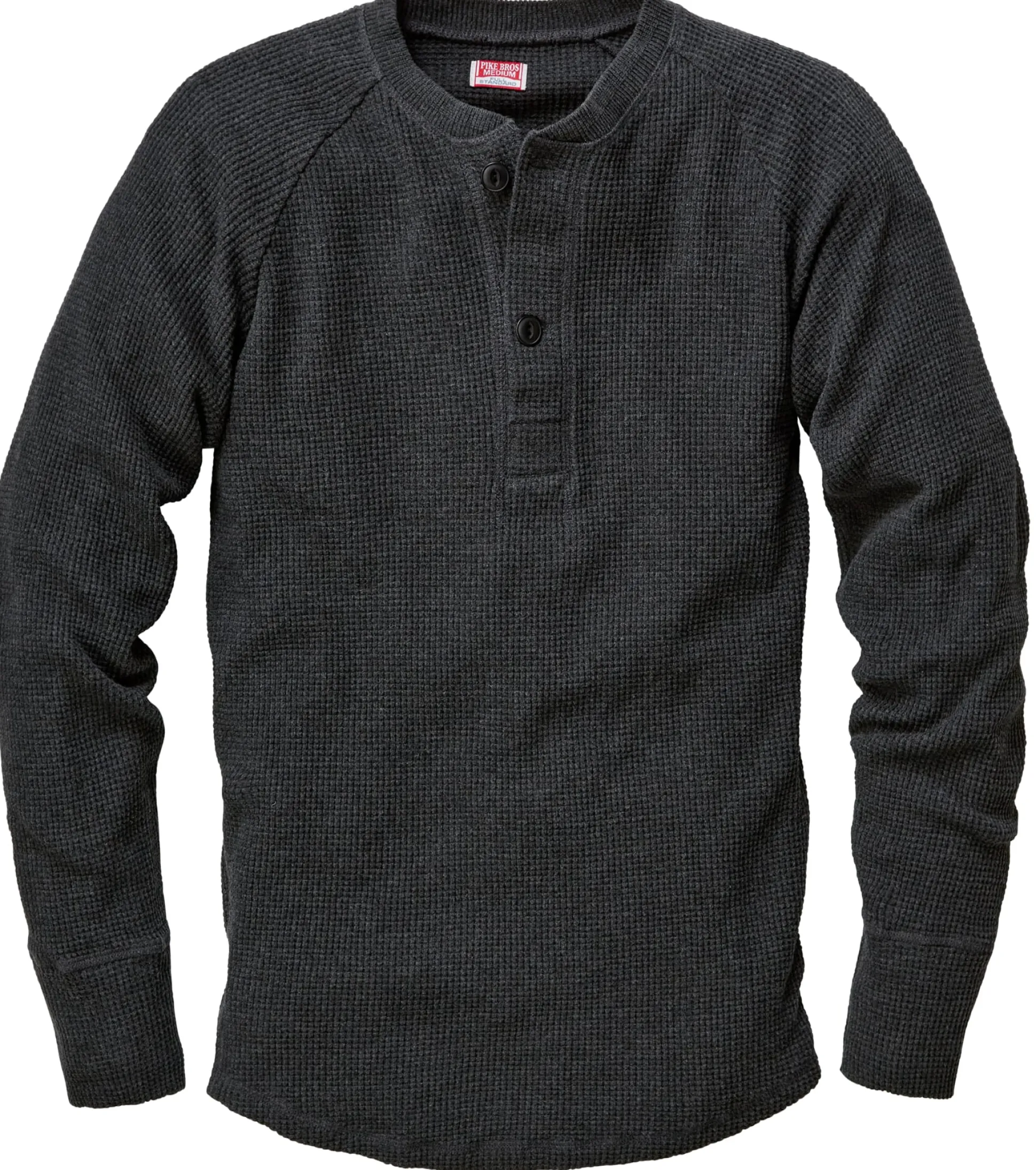 Ein Klassiker amerikanischer Herrenunterwäsche aus den 1930er Jahren: das Waffleshirt aus schwerem Baumwoll-Waffelgewebe mit weichem Griff, ausgestattet mit Raglanärmeln und Knopfleiste. An den Ärmelbündchen ist das Material gedoppelt. Seiner ursprünglichen Funktion gemäß ist das Hemd eher körpernah geschnitten. Es macht jedoch auch als Oberbekleidung eine gute Figur.