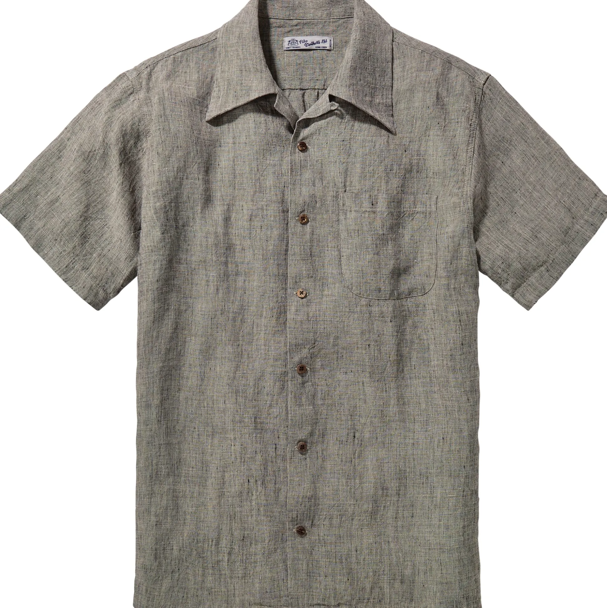 Dieses luftige und leichte Halbarmhemd ist ein klassischer Vertreter von Sommerhemden der 1940er Jahre. Die lockere, gerade Passform bietet Bewegungsfreiheit, eine aufgesetzte Brusttasche nimmt Kleinteile des täglichen Bedarfs auf und die Knopfschlaufe am Revers des eher breiten Kragens ist ganz im Stil der Zeit. Der Stoff, ein leichtes und dennoch griffiges Leinengewebe mit markantem Melangeeffekt, kommt von Emblem Weavers, einem irischen Traditionsbetrieb.