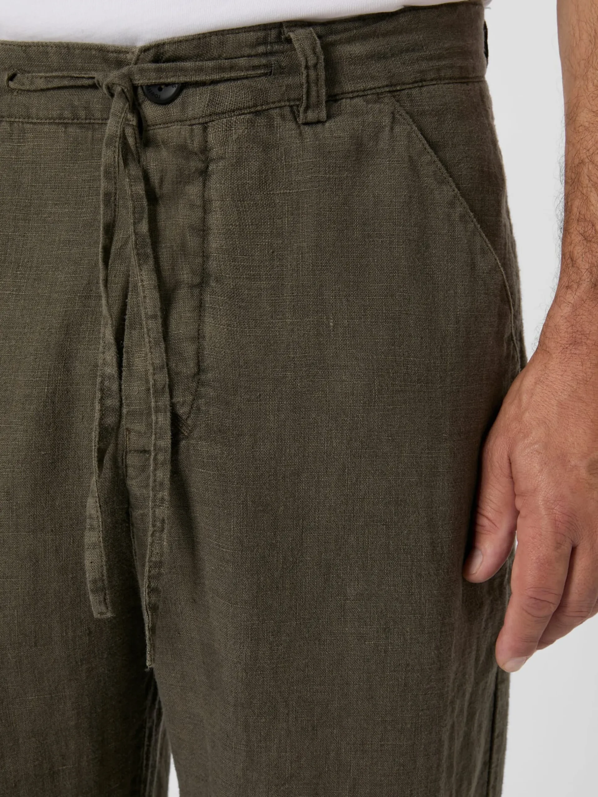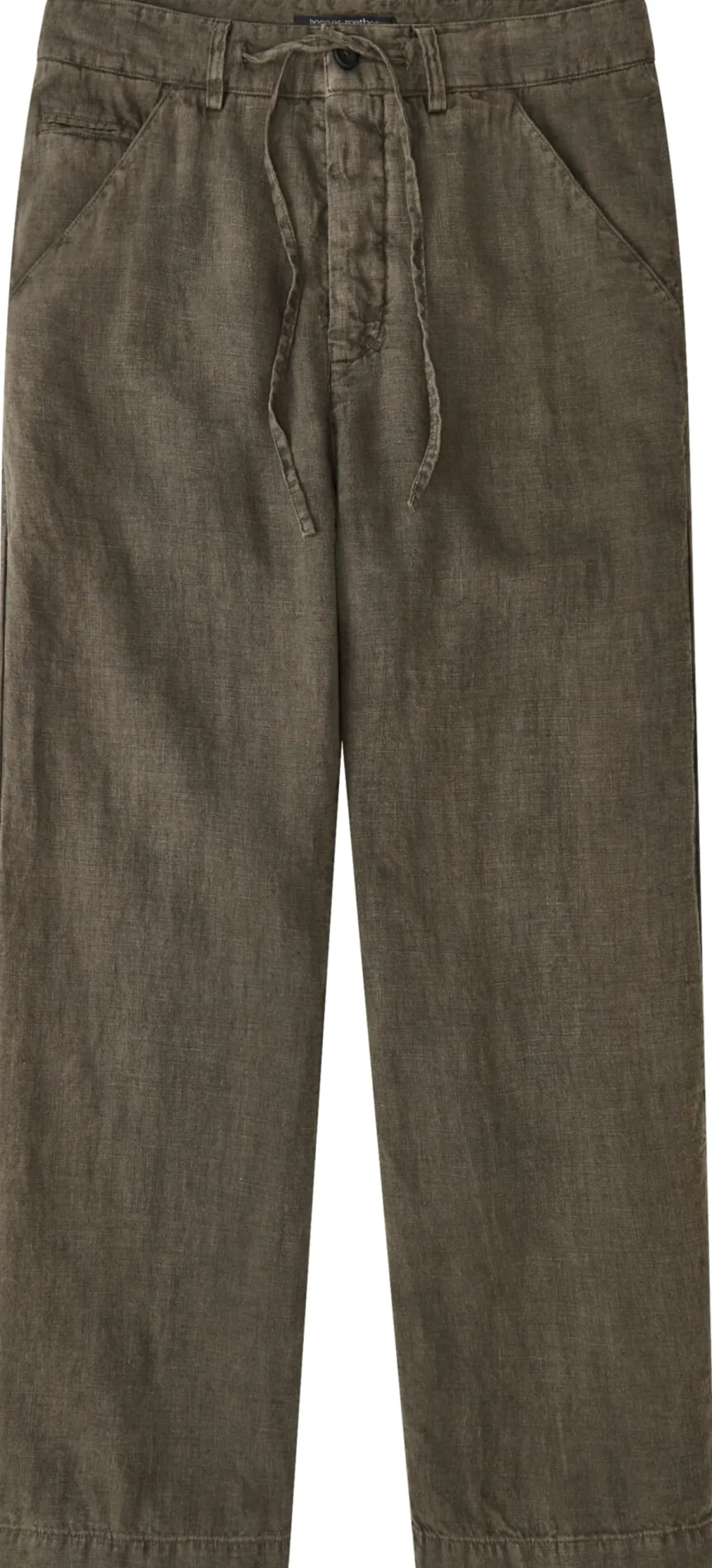 Legere Leinenhose aus locker fallendem Gewebe. Leinen hat einen glatten, festen Griff, es ist kühlend, atmungsaktiv und schmutzunempfindlich, was es zum Material der Wahl für solch eine Hose macht. Zugleich hat es dank der materialtypischen Fadenverdickungen eine markante Optik. Hannes Roether fertigt diese bequeme Hose mit Knopfleiste, Knopf und Gegenknopf im Untertritt. Zusätzlich ist ein Tunnelzug mit Bindeband im Bund eingearbeitet. Zwei Eingrifftaschen sowie eine kleine Münztasche vorn und zwei aufgesetzte Gesäßtaschen mit Patten nehmen Kleinteile des täglichen Bedarfs auf.