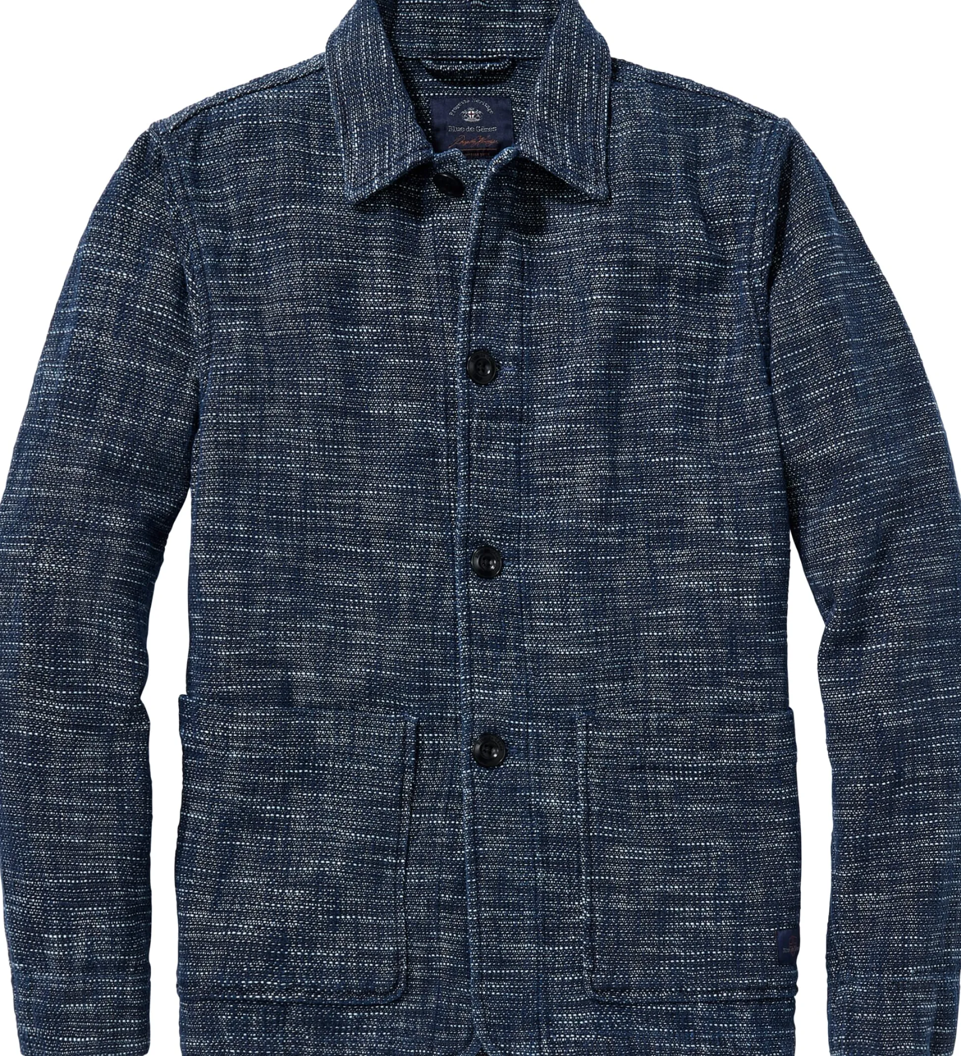 Das charaktervolle Gewebe dieses ungefütterten Overshirts besteht aus reiner, hautsympathischer Baumwolle. Seine strukturierte, geradezu bewegte Oberfläche bekommt es durch die Verwendung unterschiedlich starker und unterschiedlich gefärbter Garne. Zugleich besitzt es durch die Machart einen körnigen Griff. Das eher gewichtige Overshirt ist bequem geschnitten und mit Kentkragen und zwei großen aufgesetzten Taschen ausgestattet, es wird mit markanten Steinnussknöpfen geschlossen. Die Nähte auf der Innenseite sind sauber paspeliert.