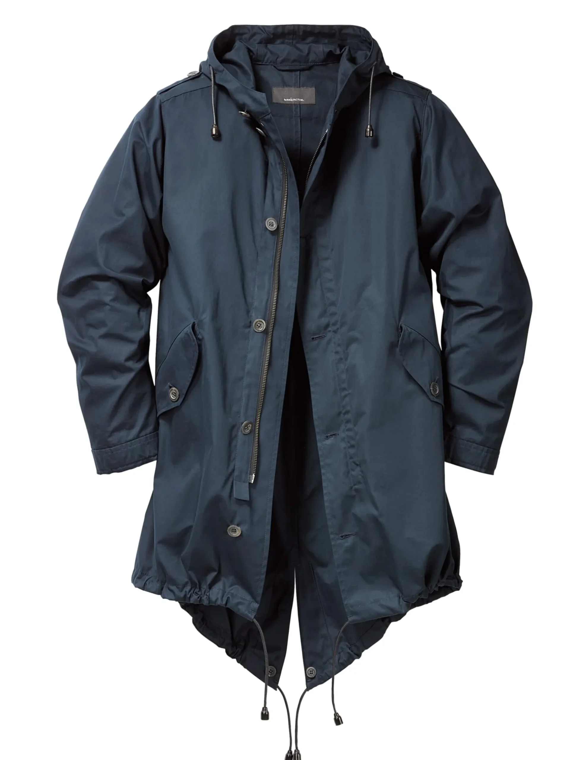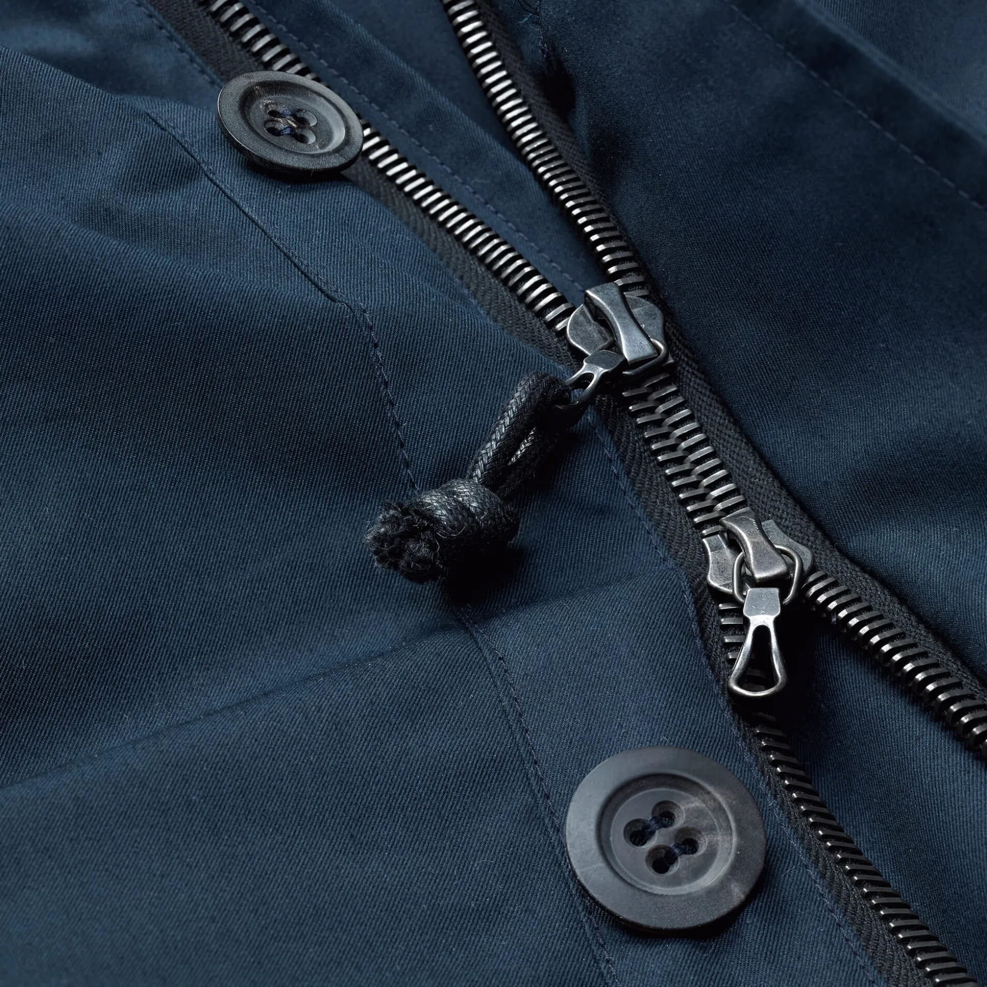 100% Baumwolle (EtaProof®). Enthält nichttextile Teile tierischen Ursprungs: Echthornknöpfe und -kordelstopper. Pattentaschen, Ärmelsaum mit Gummi im Tunnelzug, innenliegender, in Taillenhöhe mit Knöpfen verstellbarer Tunnelzug. Riri-Metallreißverschlüsse, Metallschließe an der Kapuze. Hergestellt in Polen. Rückenlänge bei Größe L = 110 cm.