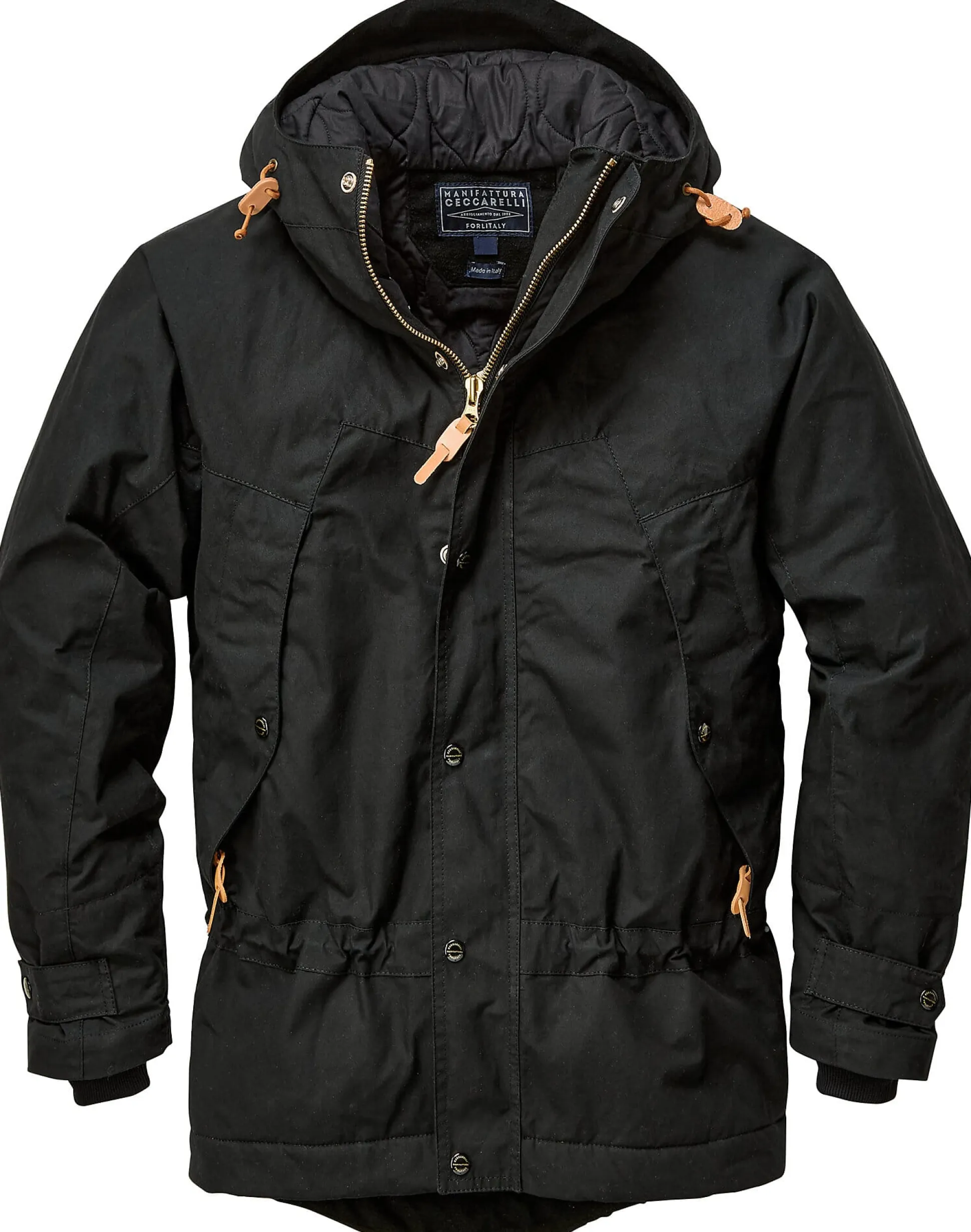 … und auch Kälte kann dem Träger dieser Parkajacke nichts anhaben. Das Obermaterial ist ein moderat gewachstes Baumwolltuch, unter dem eine wärmende Wattierung aus Schurwolle liegt (auch die geräumige Kapuze ist wattiert). Über dem Zweiwegereißverschluss liegt eine windabweisende Blende mit Druckknöpfen; Strickbündchen in den Ärmelöffnungen halten auch dort den Wind fern. Die beiden seitlichen Einschubtaschen sind mit Reißverschlüssen und darüberliegenden knöpfbaren Blenden ausgestattet – hinzu kommt eine Innentasche mit senkrecht angesetztem Reißverschluss. Die Jackenärmel sind mit Cupro, einer seidig-glatten, weichen Zelluloseregeneratfaser gefüttert, was das An- und Ausziehen erleichtert. Tunnelzüge in Taillenhöhe und im Rumpfsaum erlauben eine Weitenanpassung der Jacke, auch die Kapuzenweite lässt sich mittels Tunnelzug regulieren.