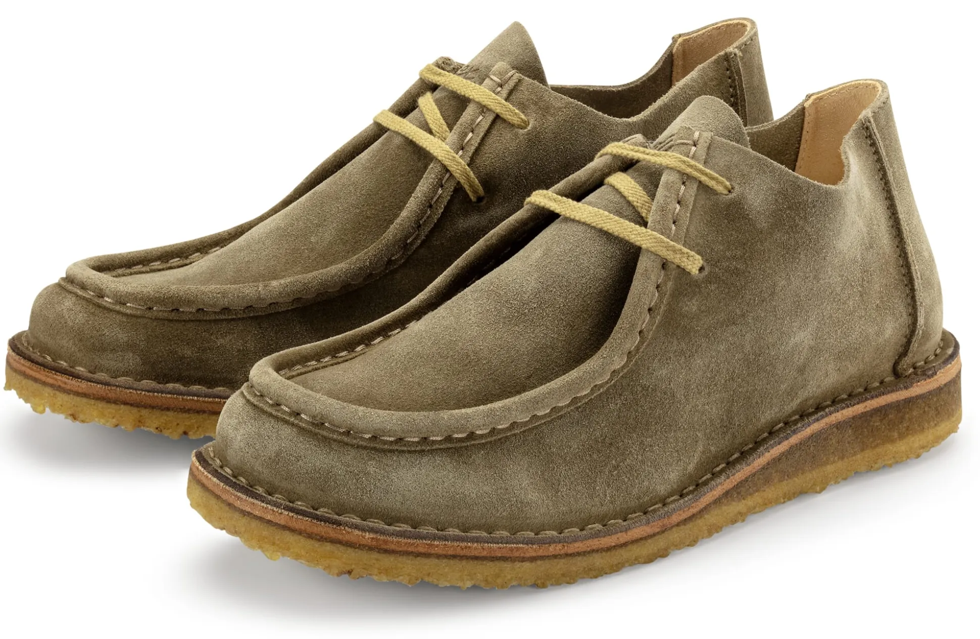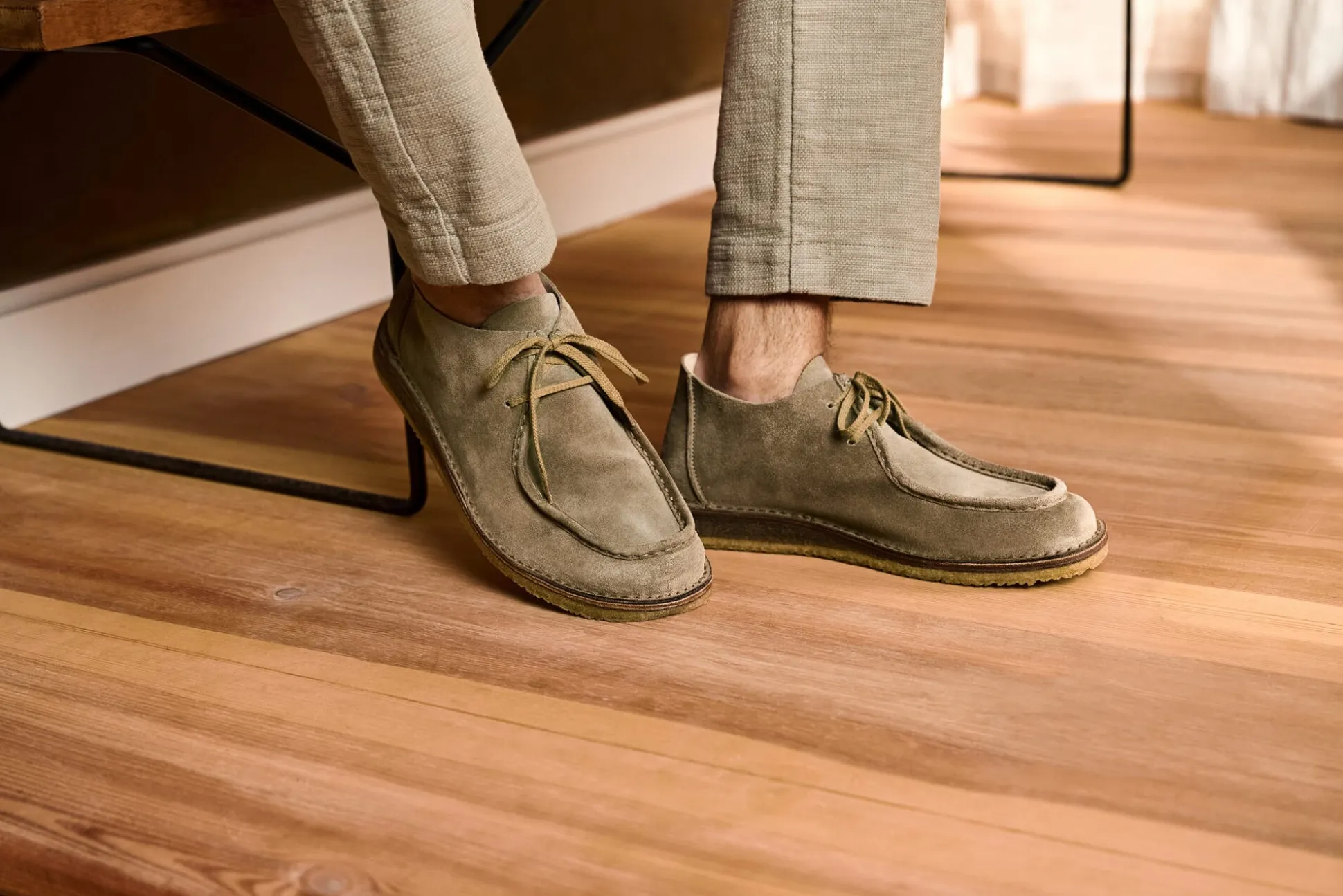 Schnitt und Material machen diesen Schuh weich und bequem. Als Obermaterial kommt vegetabil gegerbtes Veloursleder aus Meistergerbereien in der Toskana zum Einsatz. Futter und Decksohle sind aus schmiegsamem, vegetabil gegerbtem Rindleder gearbeitet. Die Kreppsohle ist aus reinem Naturkautschuk, was für eine gute Trittdämpfung sorgt. Ein markantes Detail ist der Blatteinsatz auf dem Fußrücken, der mit einer umlaufenden Mokassinnaht gefasst ist. Dank der sogenannten „Idealnaht“ entlang des Sohlenrandes, einem Qualitätsmerkmal von Astorflex, ist der Schuh äußerst flexibel und langlebig. Die Einlegesohle ist herausnehmbar, sie kann bei Bedarf durch eigene Einlagen ersetzt werden.