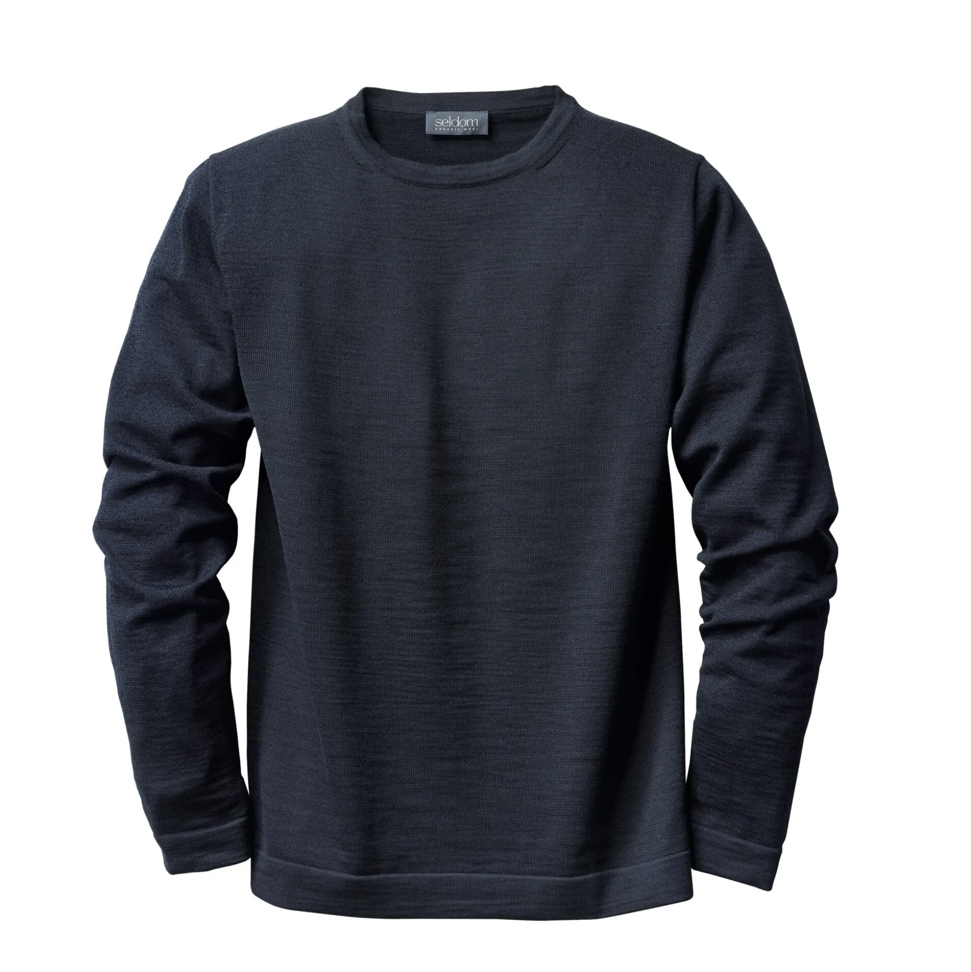 Seldom steht für ausgezeichnete handwerkliche Verarbeitung und die Auswahl bester Wollqualitäten. Dort geht man auch immer wieder neue Wege, zum Beispiel bei der Wahl dieser Merino-Schurwolle, die aus kontrolliert biologischer Tierhaltung stammt und für Seldom zu belastbaren Garnen verarbeitet wird. Glatt rechts formgestrickt, wird der Rundhalspullover in gerader Linie mit gut anliegenden Tubular-Saumabschlüssen an Ärmeln und Rumpf konfektioniert. Er kommt aus einer auf feine Gestricke spezialisierten Strickerei in Ungarn und wird dort nach Vorgaben von Seldom hergestellt. Durch ein besonderes, chlorfreies Verfahren besitzt der Pullover nur eine geringe Pillingneigung und ist daher sogar maschinenwaschbar.