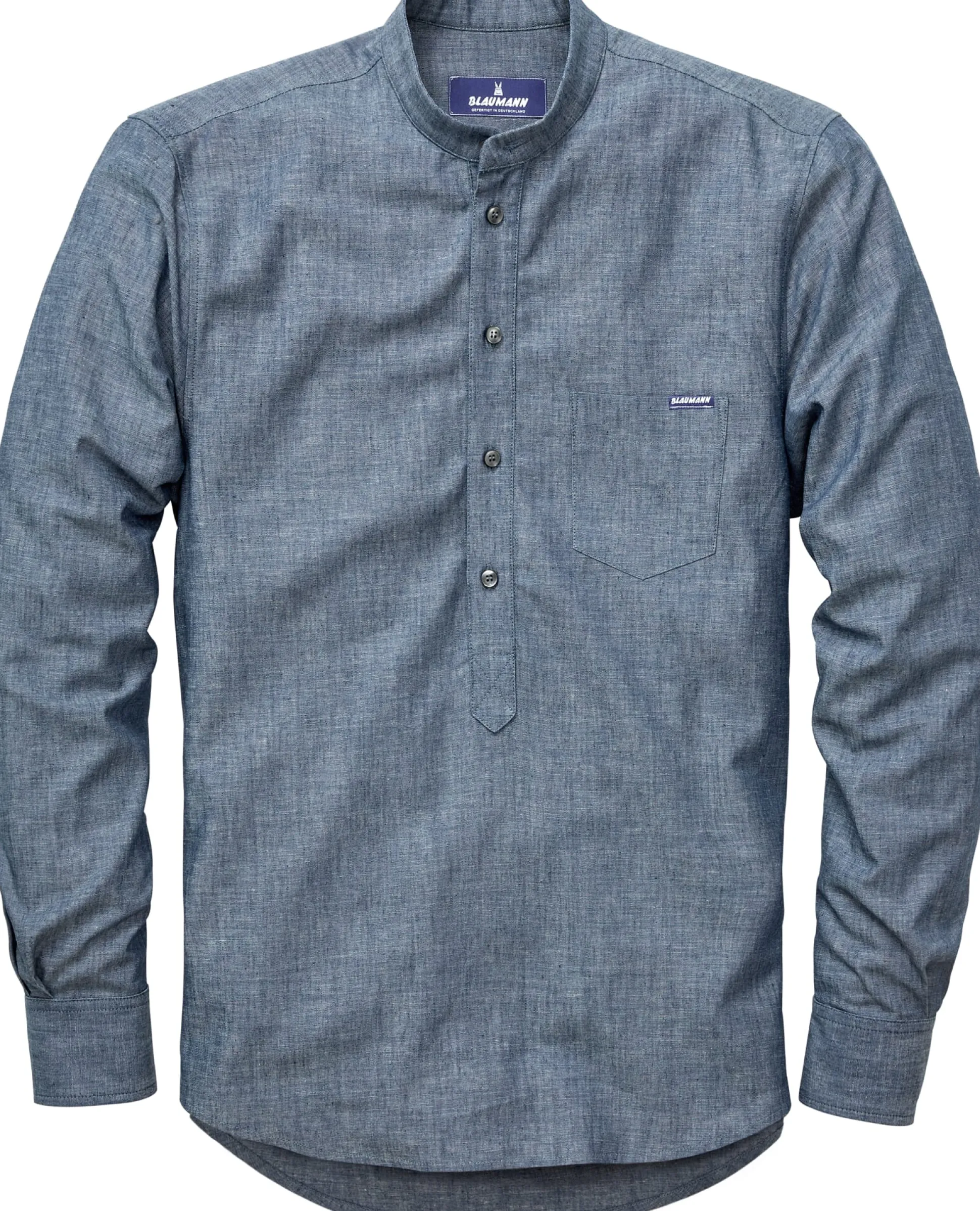Der aus Baumwolle, Leinen und Lyocell gewebte Stoff dieses Schlupfhemdes zeigt eine lebendige Melangeoptik. Blaumann fertigt das Hemd mit einem schmalen Stehkragen und stattet es mit einer Brusttasche aus.