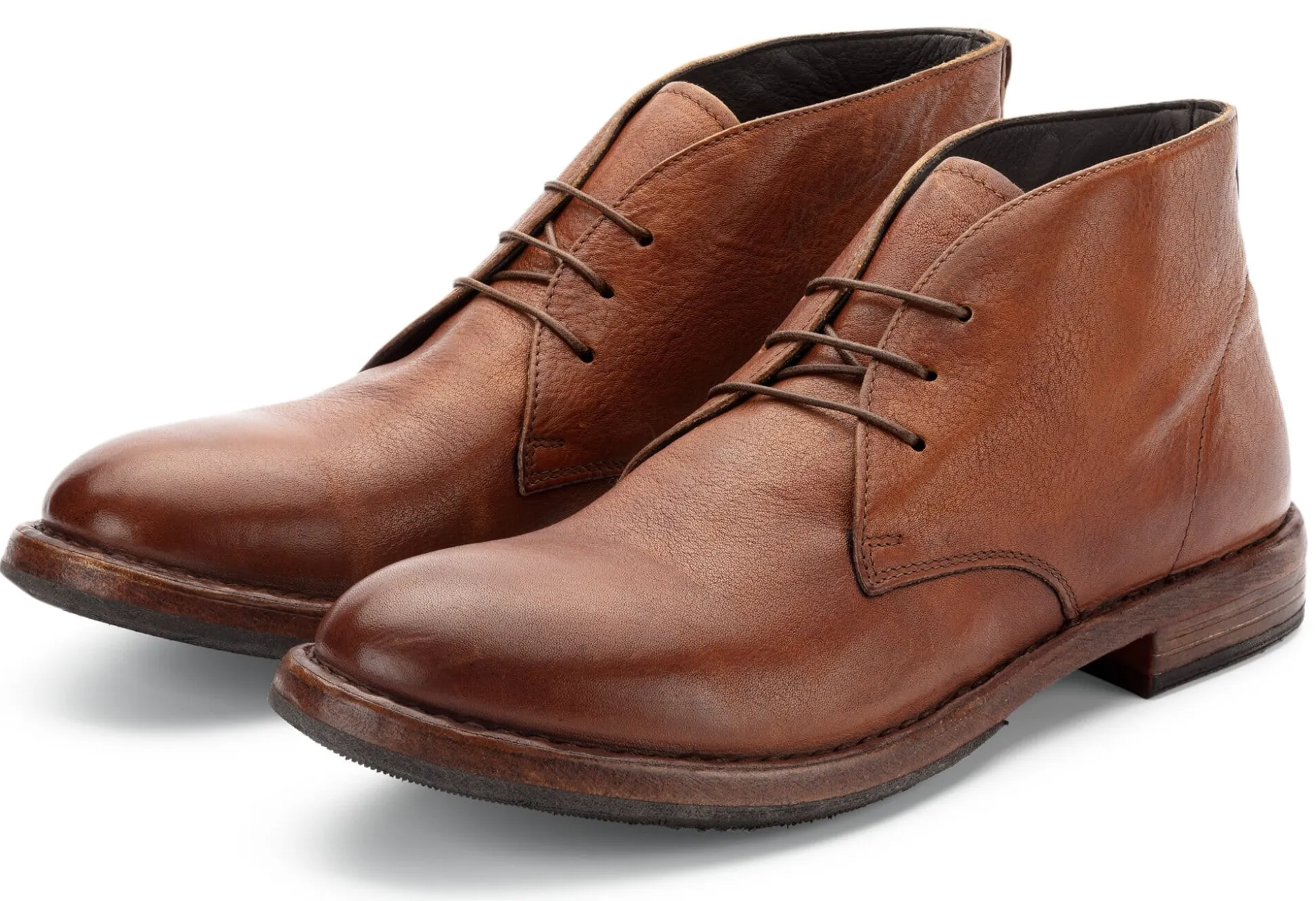 Formal ist dieser Schuh sehr nah am Chukka-Boot, jenem bequemen Schuhklassiker, der zunächst von Polospielern in den Pausen zwischen den Spielabschnitten (den „Chukkas“) zum Entspannen der Füße getragen wurde, bevor er seinen Weg in die Alltagsgarderobe fand. Moma fertigt ihn jedoch nicht aus Rau- sondern aus Glattleder. Genauer: aus weichem, markant strukturiertem Kalbleder, der dem Schuh im Zusammenspiel mit der kräftigen, seitlich rauen Ledersohle einen ausgeprägten Used Look gibt. Laufsohle und Absatz sind mit Gummi belegt, was den Schuh witterungstauglich und damit alltagspraktisch macht. Die Schnürsenkel laufen durch drei Ösenpaare.