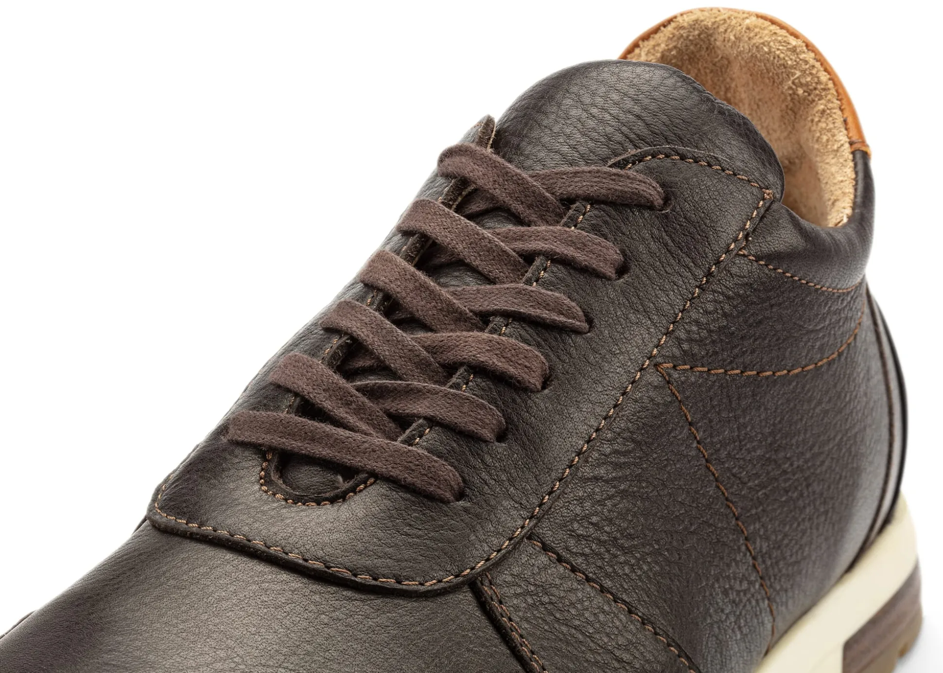 Das Obermaterial dieses sportlich-eleganten Halbschuhs im Laufschuhstil ist ein weiches, dabei aber markant genarbtes Glattleder. Innen ist der Schuh ganz mit Leder gefüttert, wobei die Fersenkappe mit Rauleder ausgeschlagen ist, was beim Tragen ein Rutschen des Schuhs verhindert. Die Laufsohle aus thermoplastischem Gummi bietet eine gute Trittdämpfung.