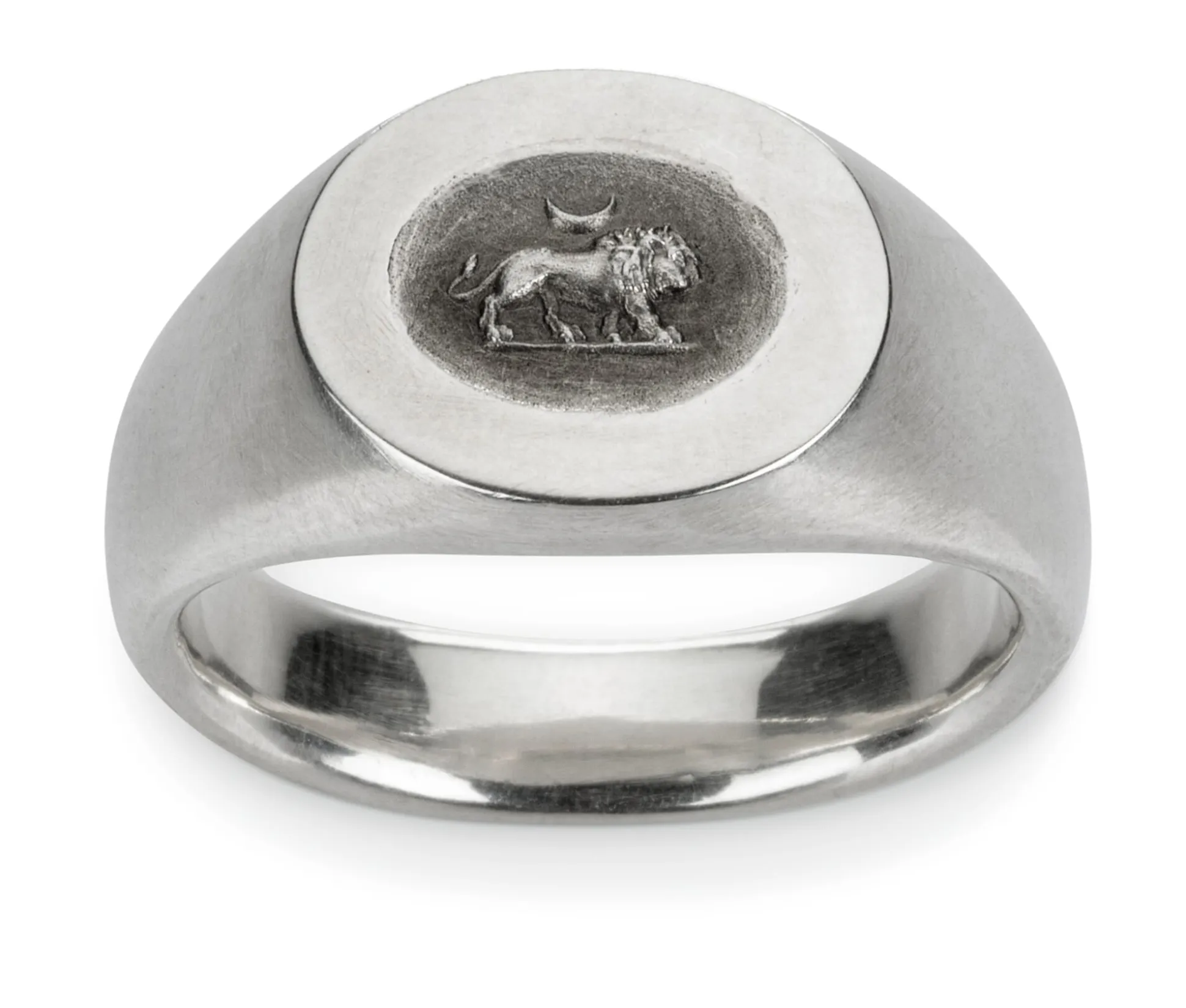 Dieser schnörkellose Ring aus massivem, gebürstetem 925er Silber zeigt im Ringkopf den Abguss einer römischen Gemme aus dem 2. bis 3. Jahrhundert unserer Zeitrechnung: Zu sehen ist ein schreitender Löwe unter einer Mondsichel, welche die ganze Szenerie dem Profanen ent- und in himmlische Sphären erhebt. Die Ringschiene ist auf der Innenseite poliert, wodurch der Ring angenehm glatt auf der Haut liegt.