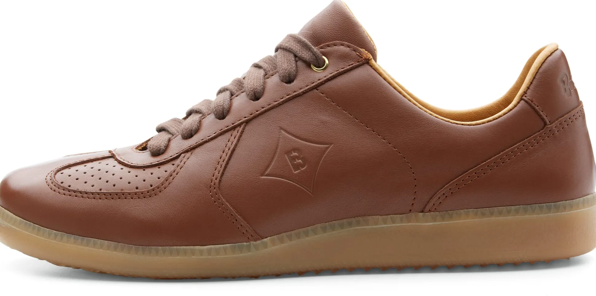 Was Sportler*innen recht ist, ist Trainer*innen billig. So entstand in den 1970er Jahren der Brütting Trainer, ein Schuh der zuvorderst für den Hallensport konzipiert war. Brütting hat diesen Klassiker aus eigenem Hause aufgegriffen, behutsam modernisiert und neu aufgelegt. Sein Obermaterial ist ein weiches Rindleder. Es ist am Vorderschuh perforiert, was für eine gute Fußbelüftung sorgt. Das Futter und die gepolsterte Decksohle sind ebenfalls aus Rindleder, das jedoch, da es direkt mit dem Fuß in Kontakt kommt, chromfrei gegerbt ist. Die Decksohle ist herausnehmbar und kann bei Bedarf durch eigene Einlagen ersetzt werden. Die Staublasche ist ebenfalls gepolstert, was den Tragekomfort erhöht. Die leicht profilierte Laufsohle aus Gummi gibt guten Grip. Sie ist bewusst in einem eher hellen Farbton ausgeführt, der einerseits gut zum Leder passt und andererseits keine Spuren auf dem Hallenboden hinterlässt.