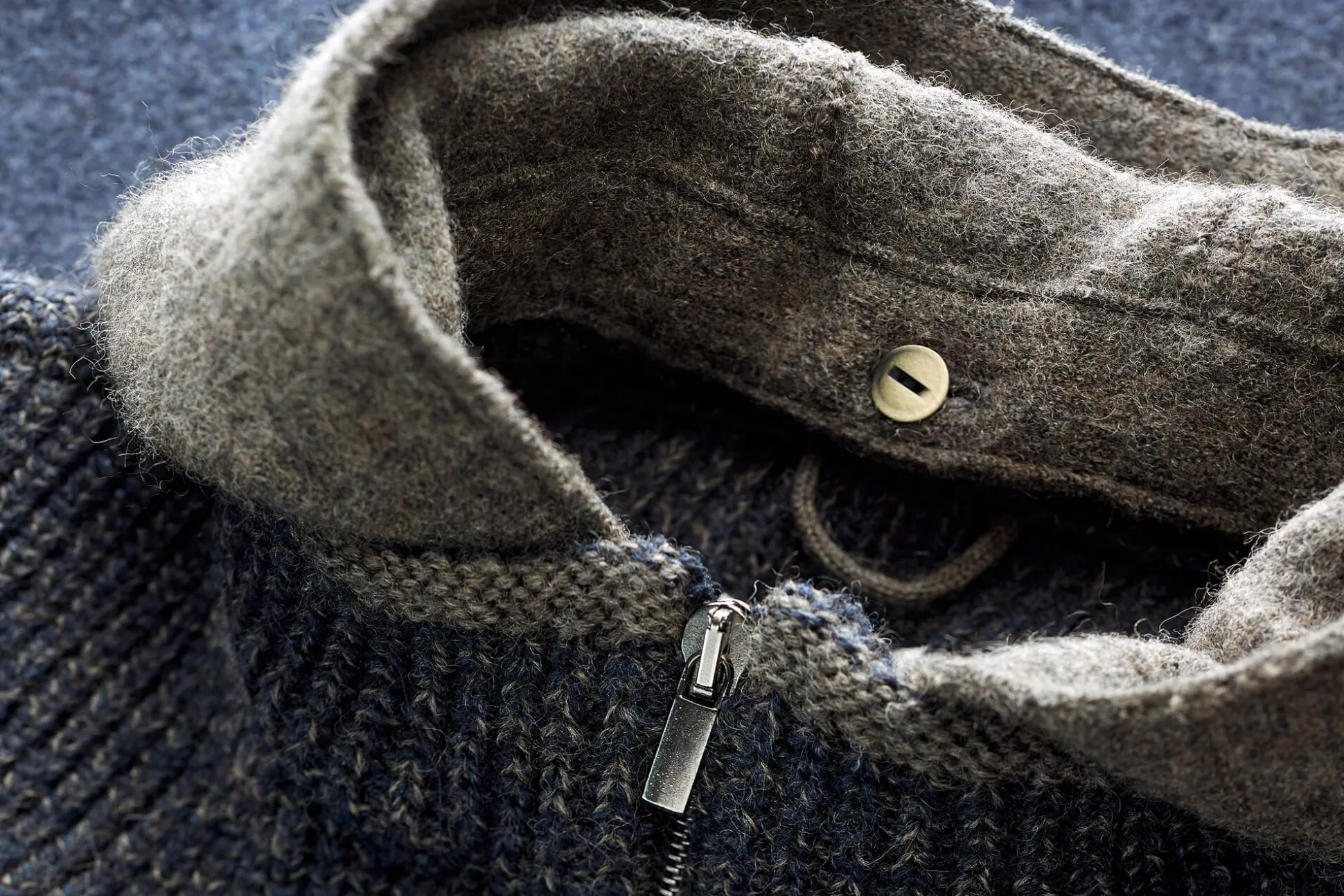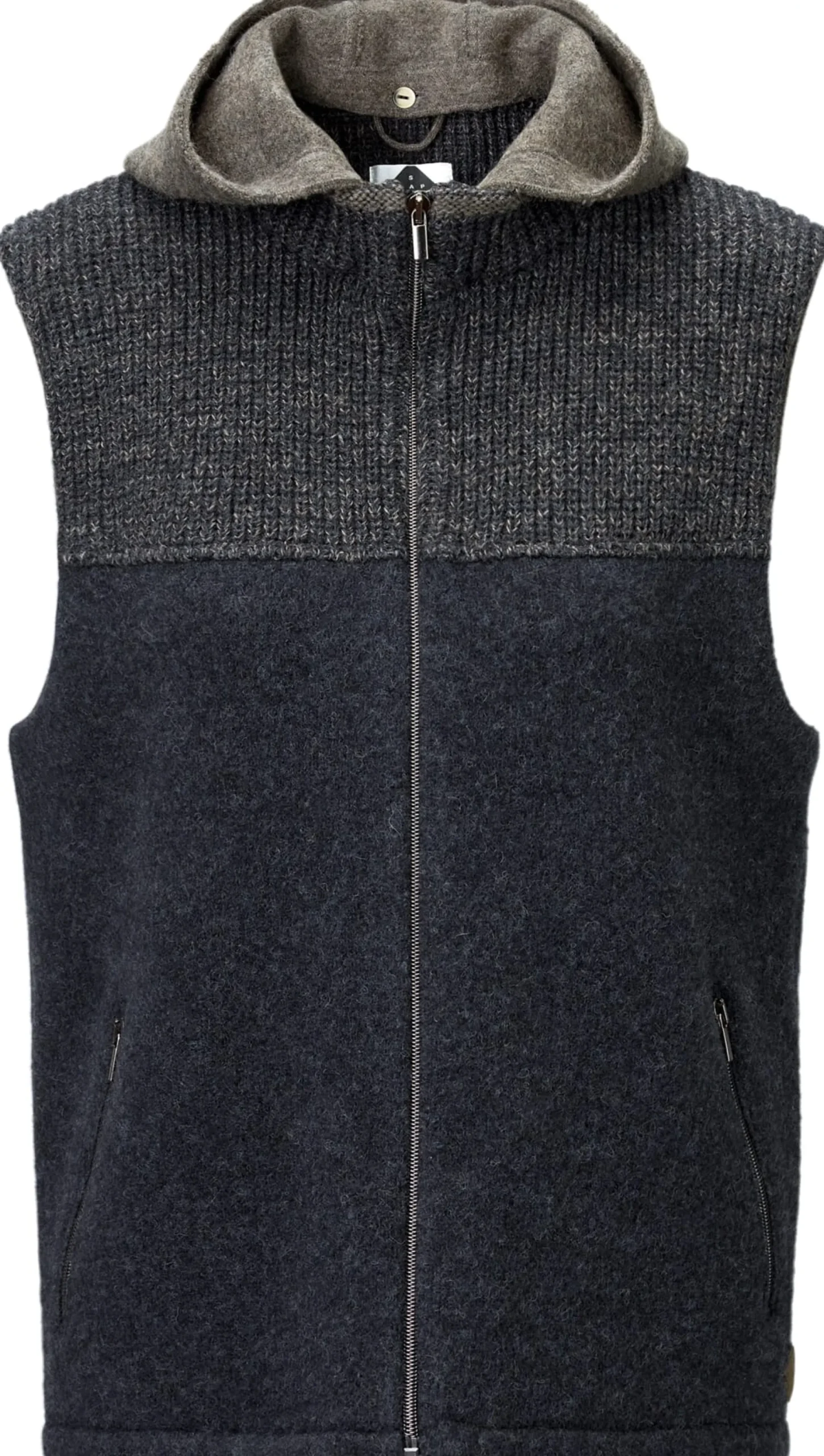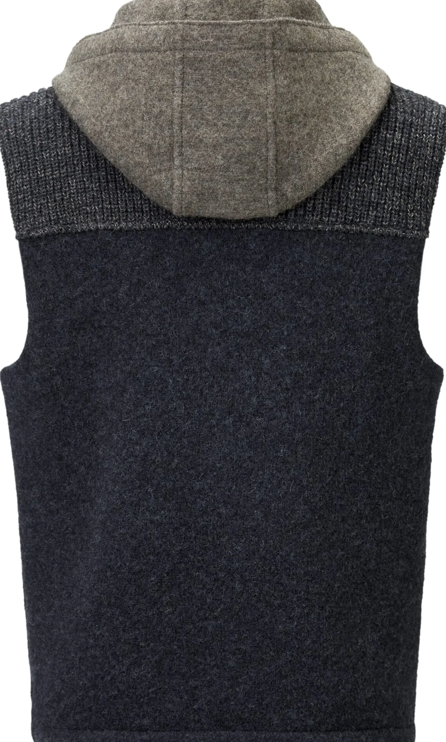 Der markante Wechsel gestrickter und gewalkter Partien macht diese Weste aus, wobei die Schulterpasse und der Stehkragen als Rippenstrick mit markanter Melangeoptik gearbeitet sind, während die Kapuze und der Rumpf aus Wollwalk bestehen. Die farblich abgesetzte Kapuze gibt der Weste zudem ein sportliches Erscheinungsbild – sie ist angeknöpft und somit abnehmbar. Der Schnitt der Weste ist „tailored“, sie ist also eher körpernah, ohne einzuengen. Vorn wird sie mittels Reißverschluss geschlossen, die beiden eingesetzten Seitentaschen sind ebenfalls mit Reißverschlüssen versehen. So unterschiedlich die Optik ist, so einheitlich ist das Material: Die Weste besteht komplett aus reiner Schurwolle und ist dadurch wärmeisolierend, angenehm klimatisierend und atmungsaktiv.