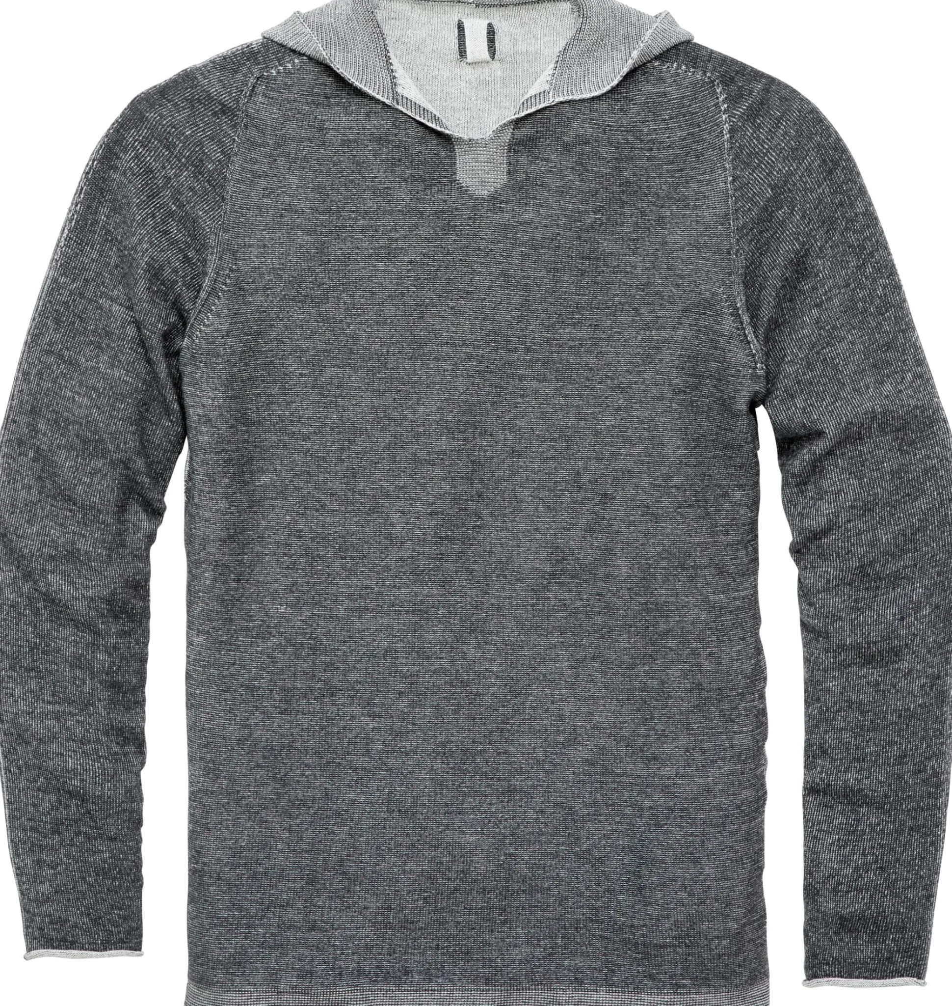 Bei diesem lässigen Hoodie sind zwei Dinge ungewöhnlich. Zunächst die Kapuze, die kontrastierend ausgeführt ist. Sodann das Material: Hannes Roether kombiniert bei dem eher leichten Gestrick mit körnigem Griff hautsympathische Baumwolle mit feinem und weichem Kaschmir – letzterer macht einen Anteil von zehn Prozent aus. Die Ärmelenden sind als schmale Rollsäume ausgeführt.