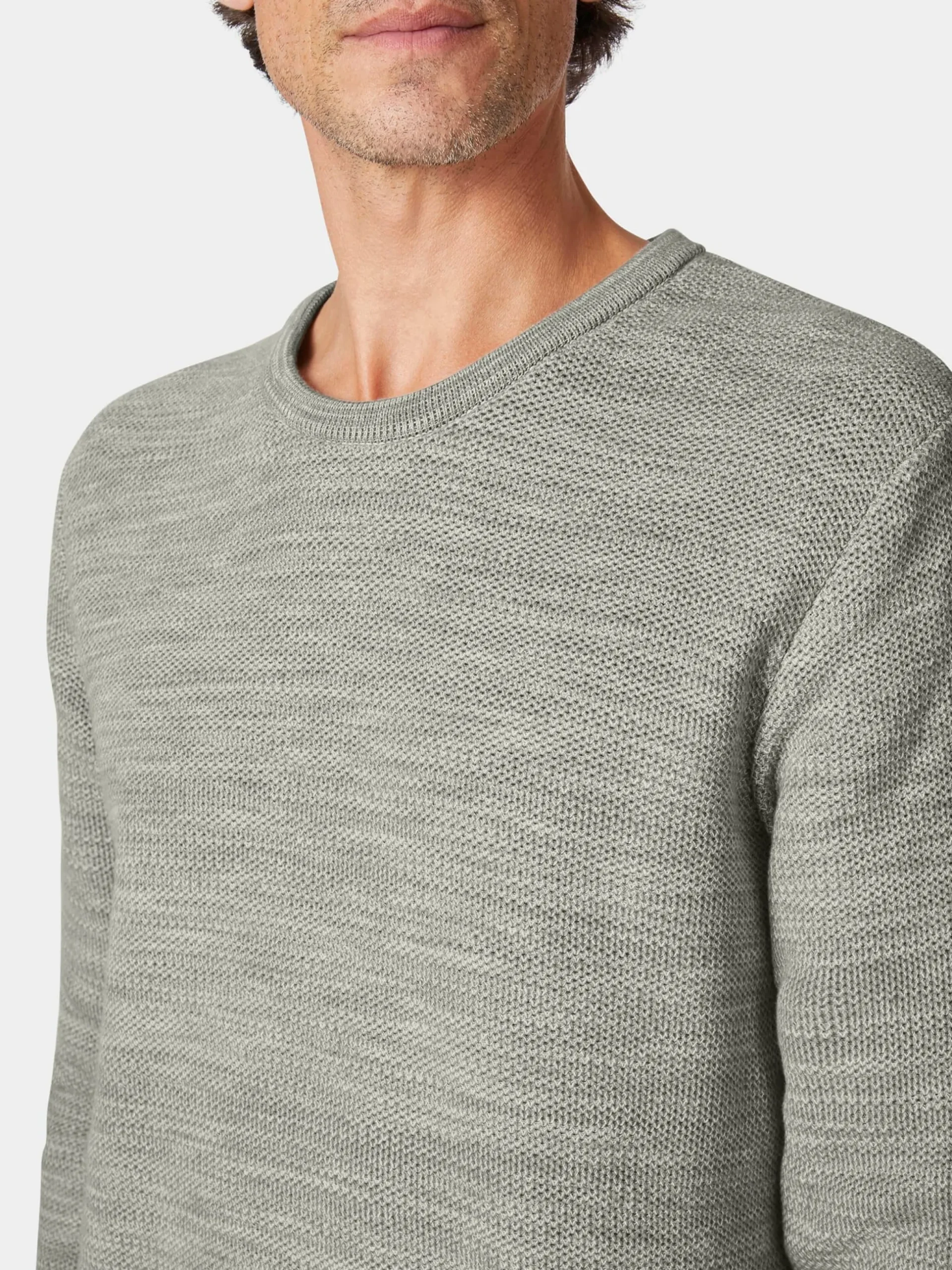 Das hautsympathische und atmungsaktive Gestrick dieses Rundhalspullovers besteht aus kontrolliert biologisch angebauter Baumwolle. Es hat einen körnigen Griff und zeigt eine markante, flammgarnartige Melangeoptik. Feine Rippenstrickbündchen bilden den Abschluss an Hals, Ärmeln und Rumpf.