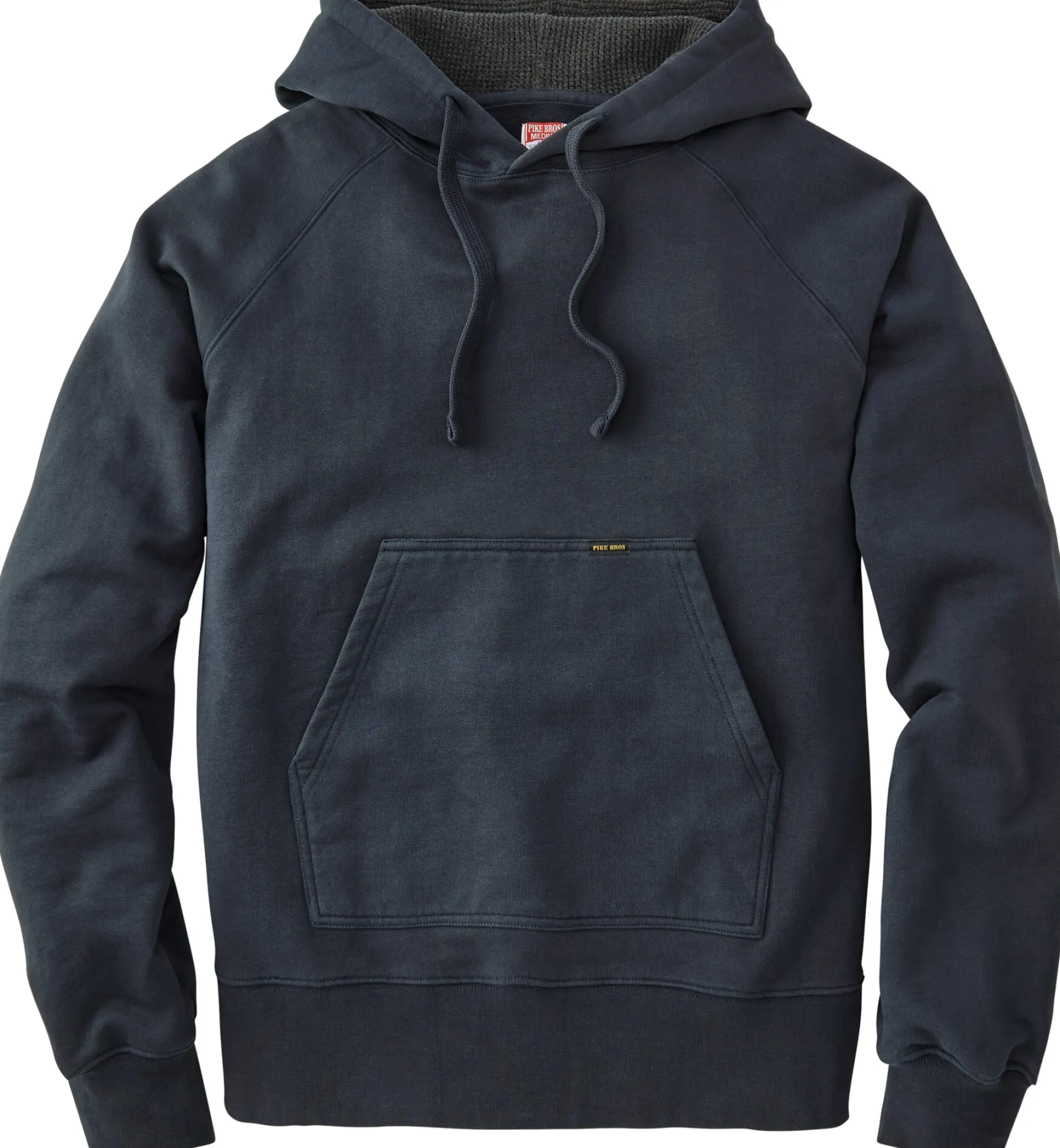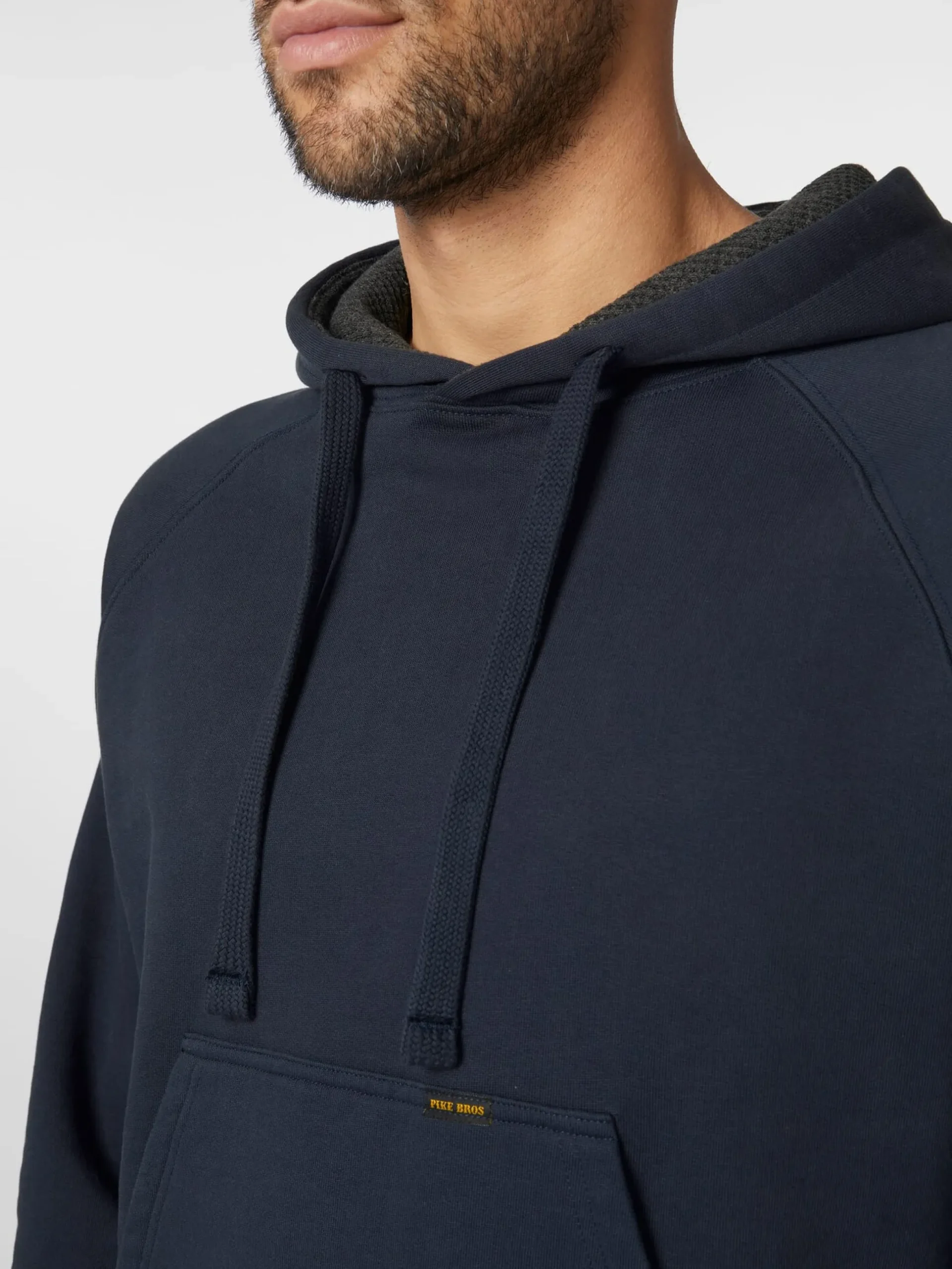 Weit und bequem, so wie es Mitte der 1960er Jahre populär war, ist dieser sportliche, schnörkellose Hoodie geschnitten. Raglanärmel erhöhen seinen Tragekomfort zusätzlich. Der Stoff ist außen glatt und innen weich, wodurch er sich angenehm auf der Haut anfühlt. Mit seinen 500 g/qm Flächengewicht macht er den Hoodie zu einem idealen Kleidungsstück für die Übergangszeit in Frühjahr und Herbst. Vorn ist ganz klassisch eine Kängurutasche aufgesetzt. Rippenstrickbündchen bilden den Abschluss an Ärmeln und Rumpf. Die Kapuze ist mit einem Band im Tunnelzug ausgestattet, innen ist sie mit einem Stoff mit plastischer Waffelstruktur gefüttert.