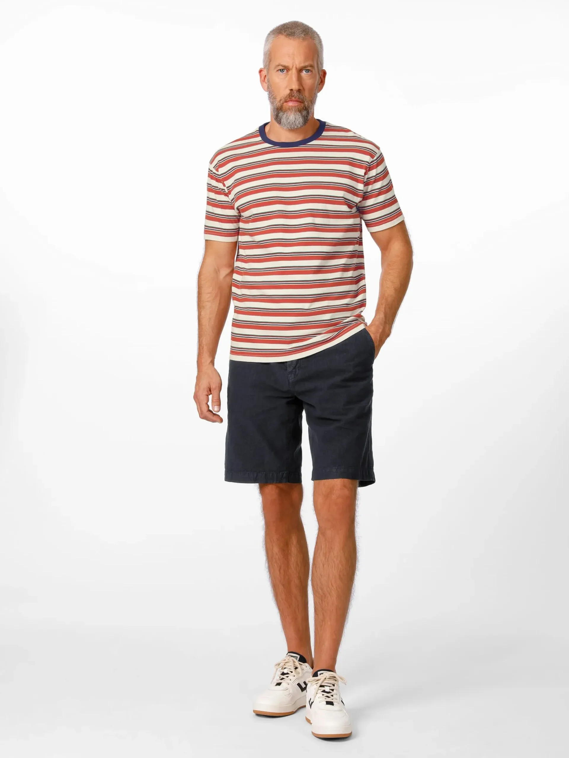 Nachdem das T-Shirt – einst ein Unterhemd – durch Leinwandgrößen wie Marlon Brando und James Dean zur populären Oberbekleidung geworden war, kamen rasch auch farbige und bunt gemusterte Ausführungen auf den Markt. So wie dieses gerade geschnittene (Regular Fit) T-Shirt im Stil der späten 1960er Jahre, dessen Streifen das zu jener Zeit ungemein populäre kräftige Orange zeigen. Ein optisches Detail ist der farbig kontrastierend ausgeführte Rundhalsausschnitt. Pike Brothers fertigt das T-Shirt aus reiner, hautsympathischer Baumwolle.