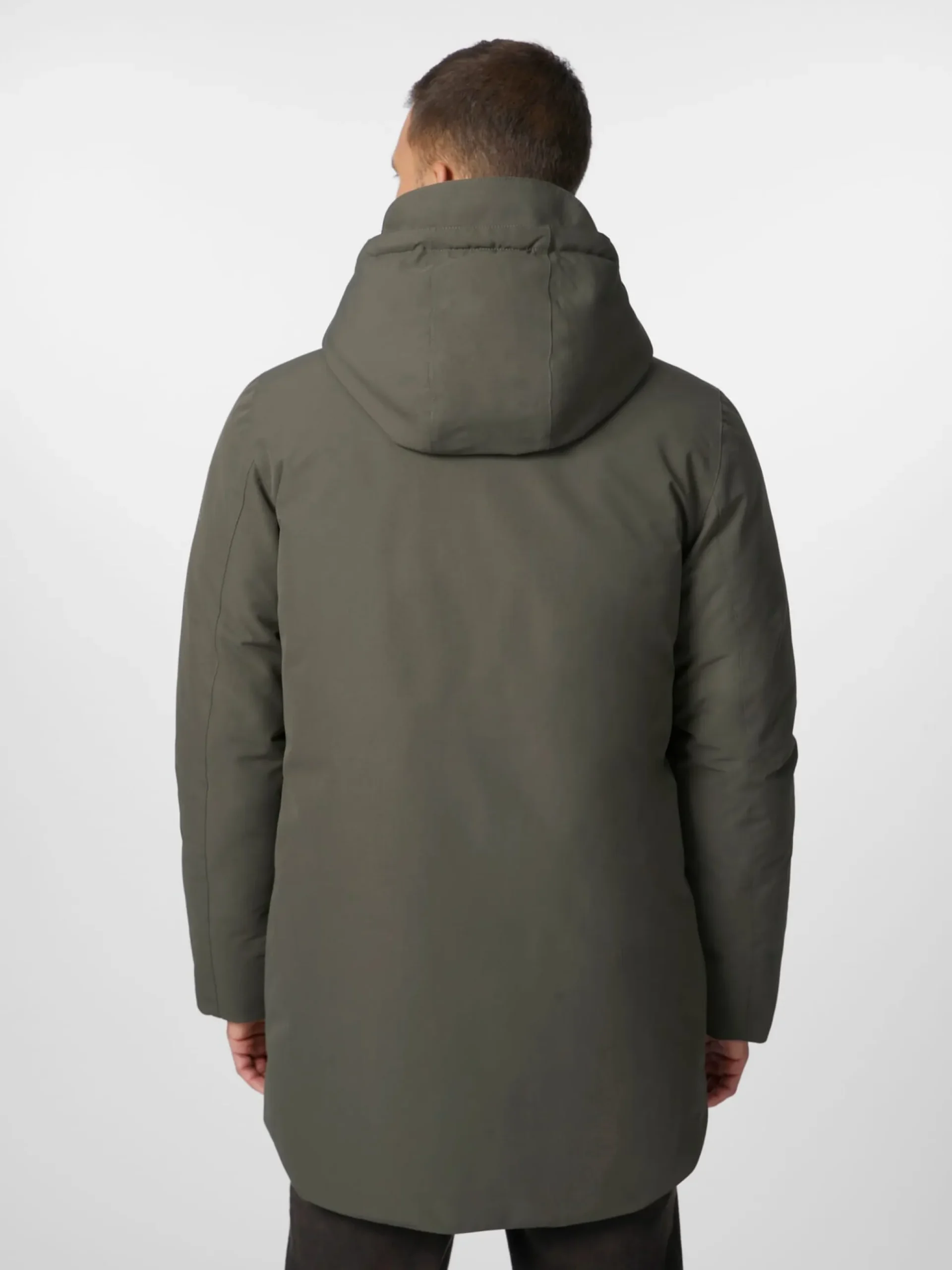 Mit diesem Parka kann der Winter kommen, denn dank seiner durchdachten Ausführung trotzt er Kälte, Wind und Wetter. So liegt über dem Zweiwegereißverschluss eine breite, windabweisende Blende mit verdeckten Druckknöpfen, Gummis im Inneren der Ärmelabschlüsse halten auch dort den Wind ab. Die gefütterte, mit Schirm und Tunnelzug gearbeitete Kapuze ist abnehmbar. Der Parka ist innen quergesteppt, damit die wärmende Füllung dauerhaft an ihrem Platz bleibt. Die beiden Schubtaschen vorn sind mit wasserabweisenden Reißverschlüssen ausgestattet, hinzu kommt eine nahteingesetzte Sicherheitstasche mit Reißverschluss im Ärmel. Innen ist der Parka mit einer Innentasche mit Reißverschluss und zwei übereinander liegenden Einstecktaschen gearbeitet. Der griffige Oberstoff, die voluminöse Füllung sowie das glatte Futter bestehen vollständig aus Recycling-Polyester, was den Parka zu einem wärmenden Leichtgewicht macht.