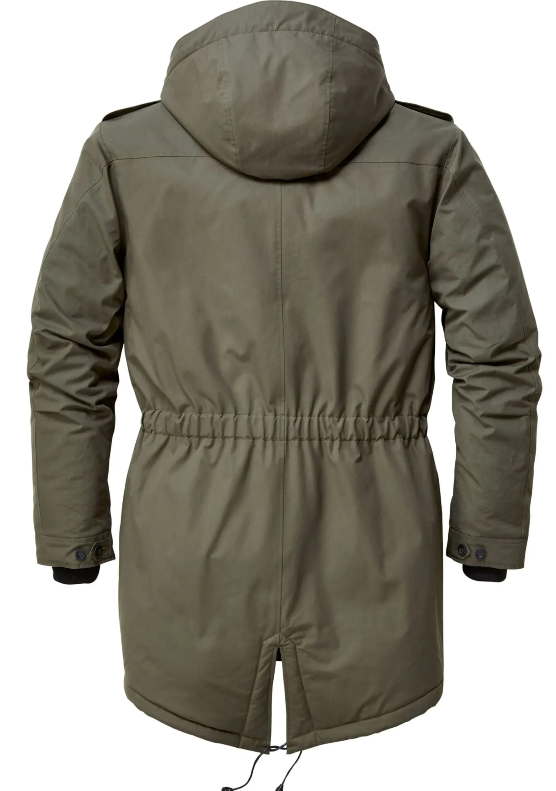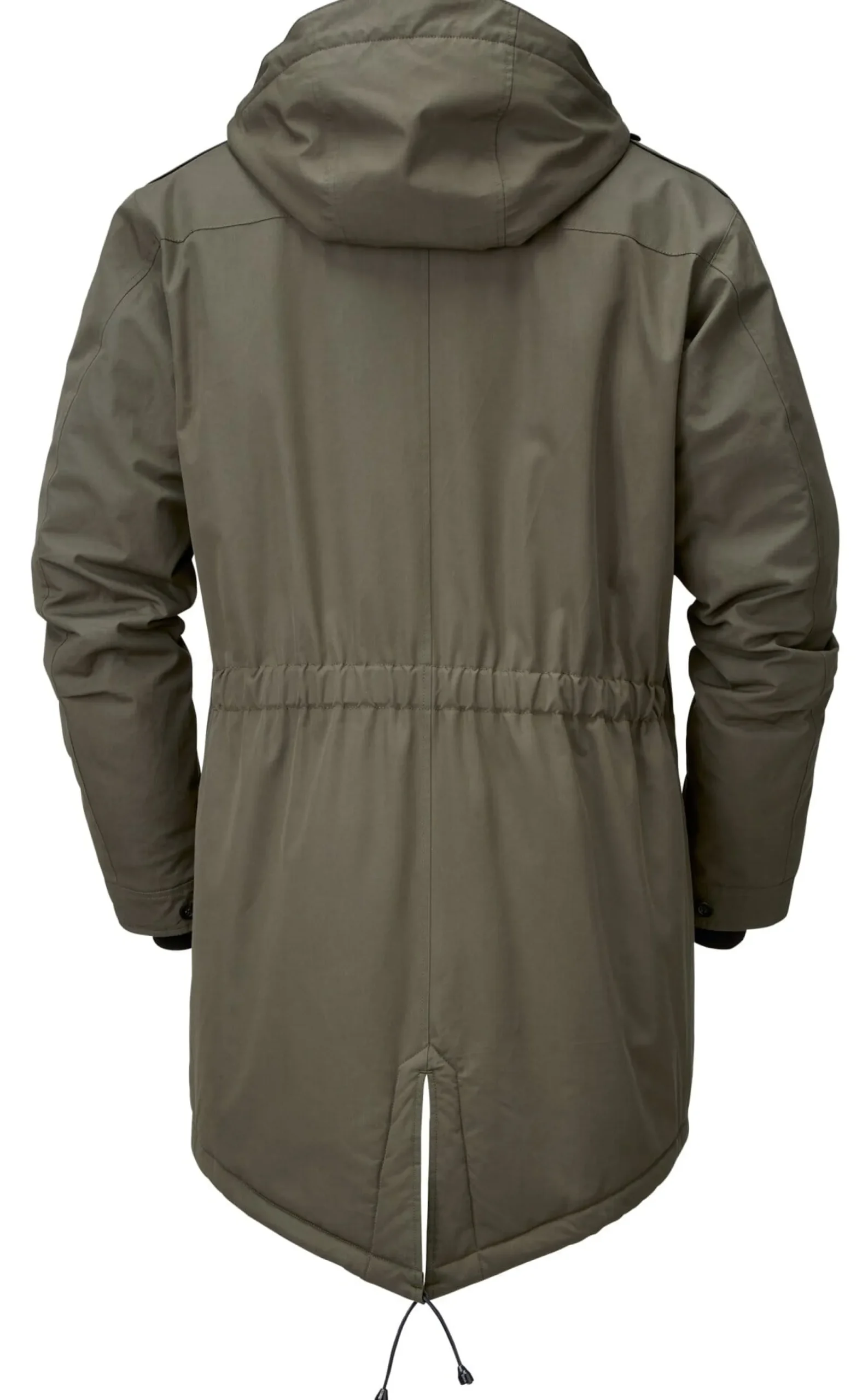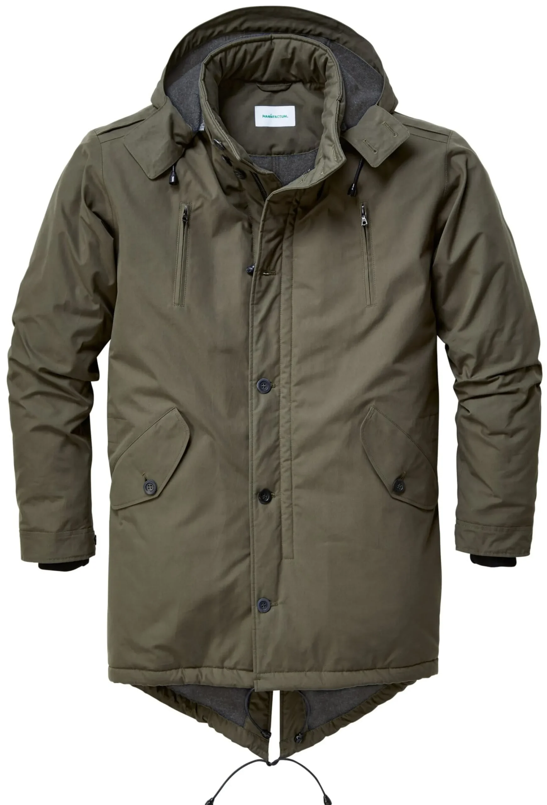Vom Schnitt her eindeutig ein Parka: eher lang mit Schwalbenschwanz und Kapuze. Wir lassen ihn in einer winterfesten und detailreichen Ausführung konfektionieren. Über dem Zweiwegereißverschluss von Riri liegt eine knöpfbare Blende, die Ärmelöffnungen sind mit eng anliegenden, windabweisenden Strickbündchen ausgestattet. Die abnehmbare Kapuze ist ebenso wie der gesamte Parka wattiert. Der wärmende Effekt dieser Wattierung wird vom wollenen Futter noch verstärkt, das Obermaterial des Parkas ist EtaProof®. Tunnelzüge in der Kapuze, auf Taillenhöhe und am Rumpfsaum ermöglichen eine individuelle Weitenanpassung. Zwei eingesetzte geknöpfte Pattentaschen vorn, zwei senkrecht eingesetzte Reißverschlusstaschen auf der Brust und zwei Innentaschen nehmen Kleinteile des täglichen Bedarfs auf.