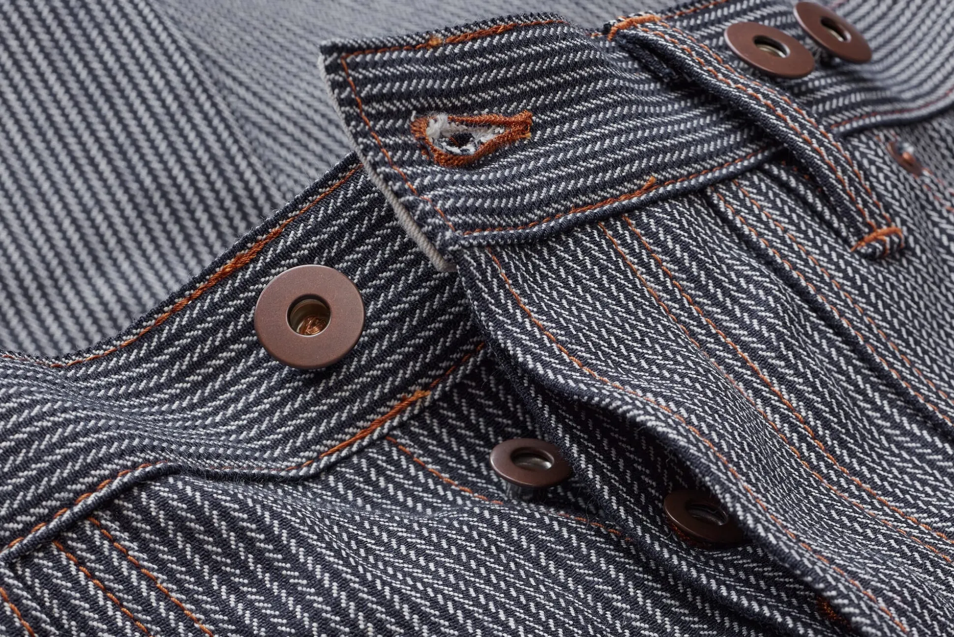 Das markante und kontrastreiche Fischgratgewebe für diese Hose bezieht Blaumann aus einer japanischen Weberei. Passend zum kernigen Material ist auch der Schnitt: sein Vorbild ist eine klassische Arbeitshose im 5-Pocket-Stil mit zusätzlicher Hammerschlaufe. Die Hose wird mittels Knopfleiste und Knopf geschlossen und sie ist mit Gürtelschlaufen und Hosenträgerknöpfen ausgestattet.