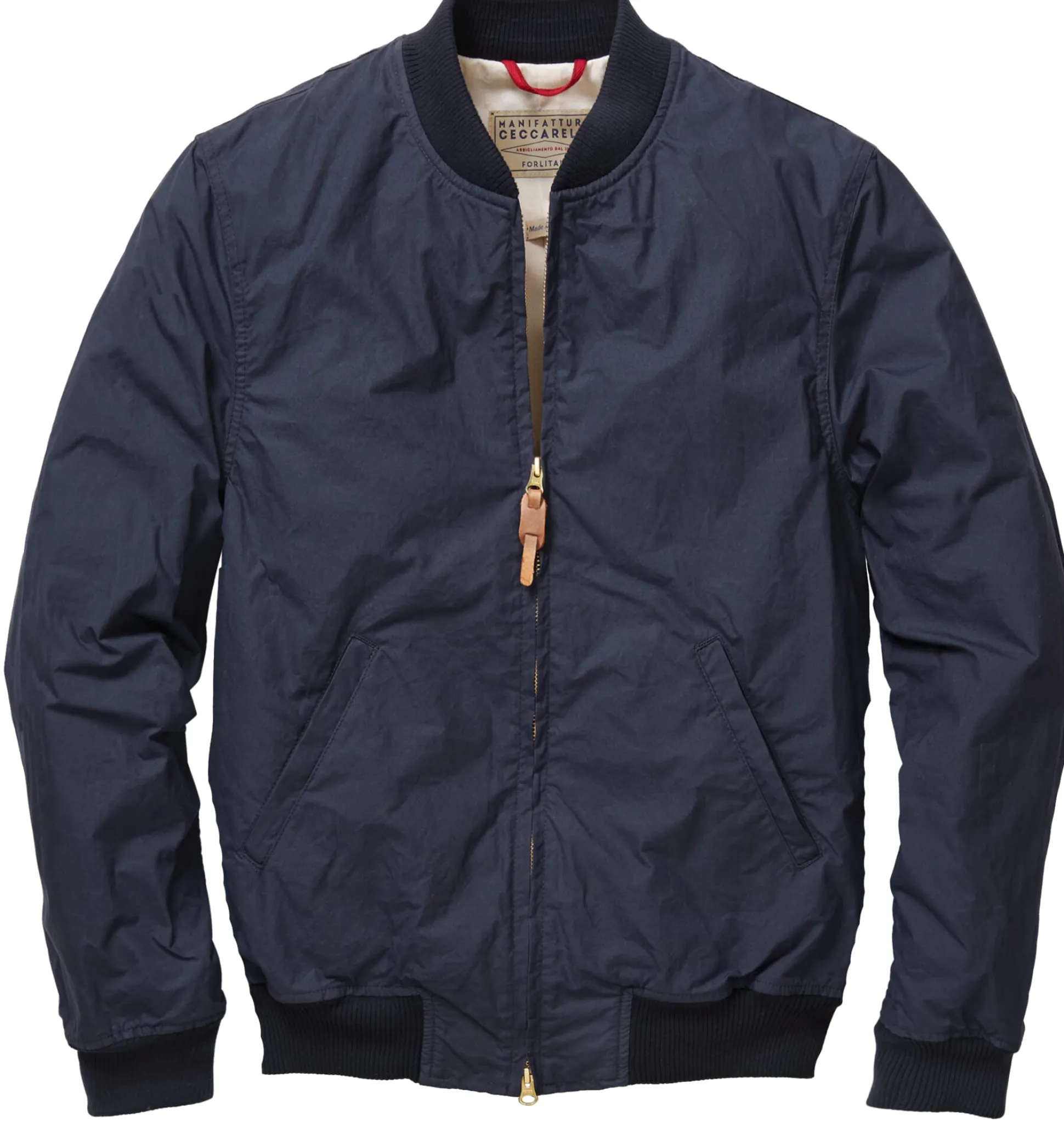 Aus einem gewachsten („dry waxed“) Baumwolltuch fertigt Ceccarelli diesen Blouson. Der Stehkragen sowie die Abschlüsse an Ärmeln und Rumpf sind als feiner Rippenstrick gearbeitet. Die Jacke wird mittels eines Zweiwegereißverschlusses geschlossen. Sie ist mit zwei Eingrifftaschen und einer Innentasche mit Reißverschluss ausgestattet. Bis auf ein Teilfutter im Rücken ist die Jacke ungefüttert.