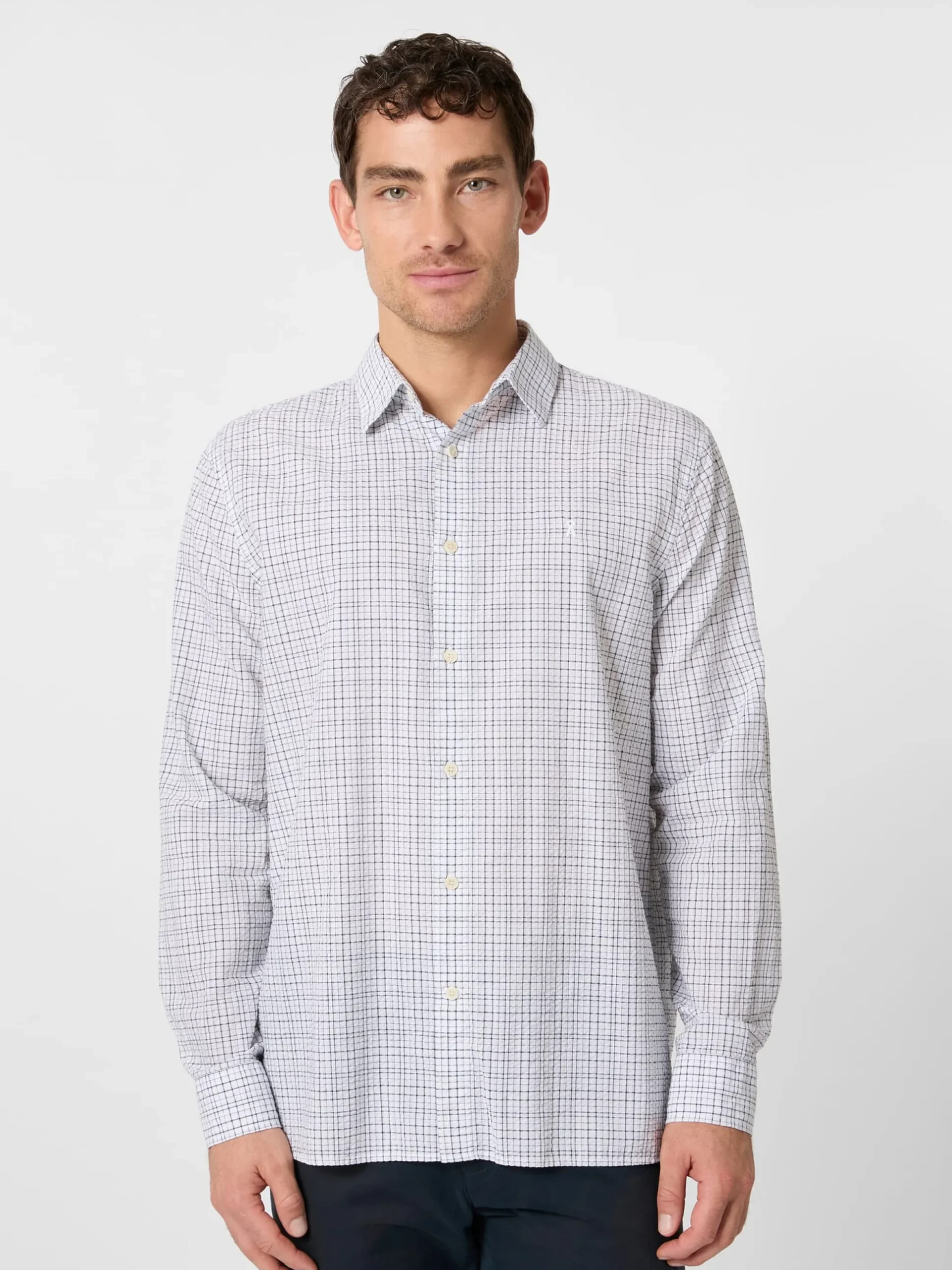 Ein Seersucker zeichnet sich durch eine kreppartige, dreidimensionale Oberfläche aus, die durch die Webart mit unterschiedlich gespannten Kettfäden entsteht. Sie sorgt dafür, dass ein Seersucker nie ganz auf der Haut aufliegt, was für gute Luftzirkulation sorgt und ihn zum idealen Stoff für Sommerbekleidung macht. Der Name ist übrigens aus dem Persischen abgeleitet: „Shir o shekar“ steht dort für „Milch und Zucker“ und spielt auf die wechselnden glatten und gerafften Streifen an. Als der Stoff im 19. Jahrhundert von den Briten in die westliche Welt gebracht wurde, wurde der ursprüngliche Name zur englischen Bezeichnung Seersucker verschliffen. Der Stoff dieses Hemdes zeigt zusätzlich zur charaktervollen Webstruktur ein markantes unregelmäßiges Karomuster. Armedangels fertigt das Hemd mit Kentkragen und passend zum sportlichen Charakter ohne Brusttasche. Gelegte Falten unter der Schulterpasse erhöhen den Tragekomfort. Die verwendete Baumwolle stammt aus kontolliert biologischem Anbau.