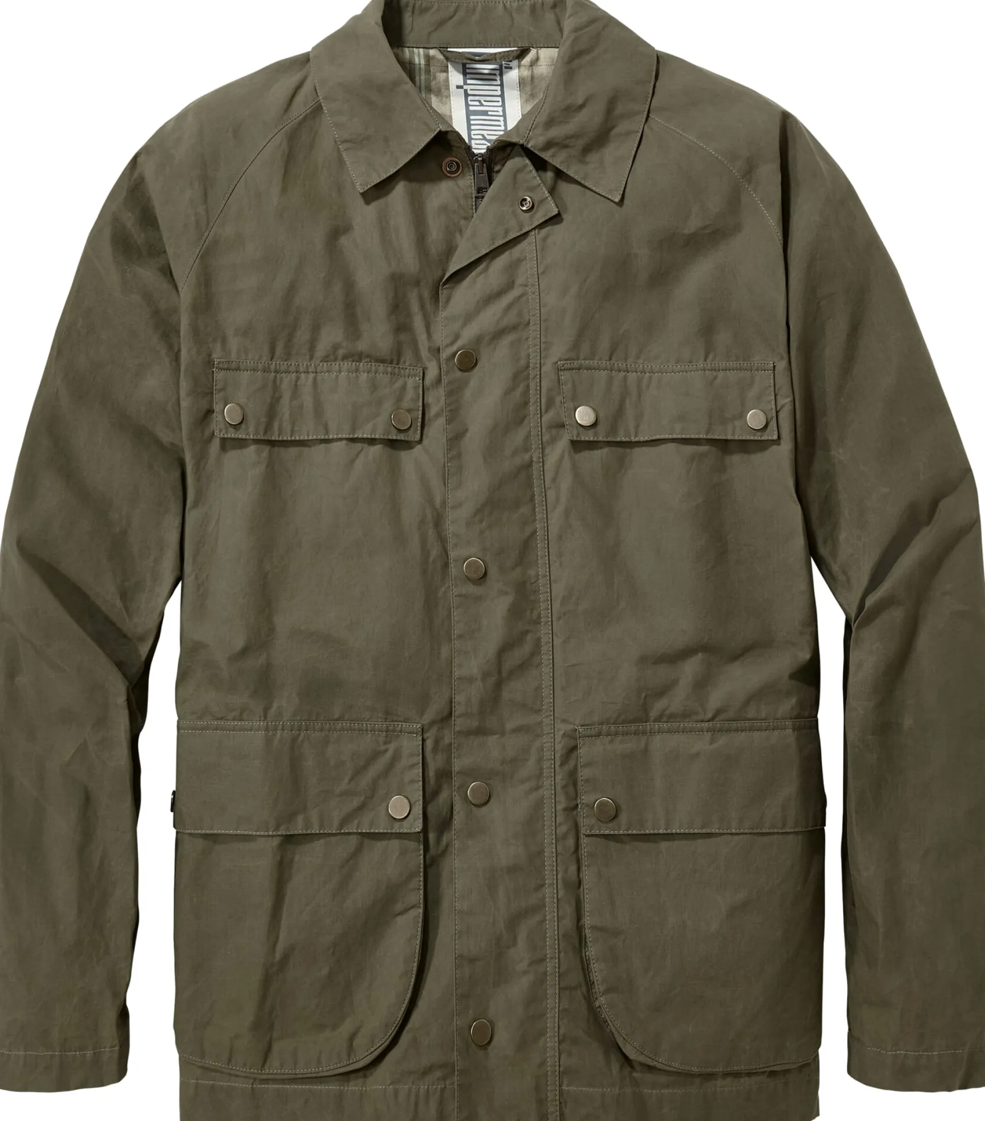 Hier kommt eine Jacke, bei welcher der arg strapazierte Begriff Funktionskleidung wirklich zutrifft. Der Stoff und die Details sind rein nach funktionalen Aspekten ausgewählt und der Schnitt ist so gestaltet, dass er die natürlichen Bewegungen des Körpers nicht einschränkt. Das beginnt beim Oberstoff, einem griffigen, paraffingetränkten (und damit in Maßen wasserabweisenden und trotzdem flexiblen) Baumwolltuch. Die Ärmel sind als Raglanärmel ausgeführt, was den Tragekomfort erhöht und eine obenliegende Schulternaht vermeidet, durch die leichter Feuchtigkeit eindringen könnte. Das Rumpffutter aus Baumwolle mit Polyesteranteil ist hautsympathisch und robust zugleich, das Ärmelfutter aus Polyester und etwas Elastan sorgt für bequemes An- und Ausziehen. Reißverschlüsse und Druckknöpfe sind aus solidem Metall. Über dem Reißverschluss liegt eine windabweisende geknöpfte Blende, mit dem ebenfalls geknöpften Sturmriegel im Kragen lässt sich die Jacke bei Bedarf hoch schließen. Zwei geknöpfte Rückenschlitze sorgen für guten Sitz. Selbst die Taschen sind durchdacht. Vorn sind zwei voluminöse Taschen mit doppelt geknöpften Patten aufgesetzt. Hinzu kommen zwei eingesetzte Brusttaschen, ebenfalls mit doppelt geknöpften Patten. Zwei Innentaschen mit senkrechtem Eingriff, eine geknöpft und eine mit Reißverschluss, vervollständigen den Stauraum der Jacke.