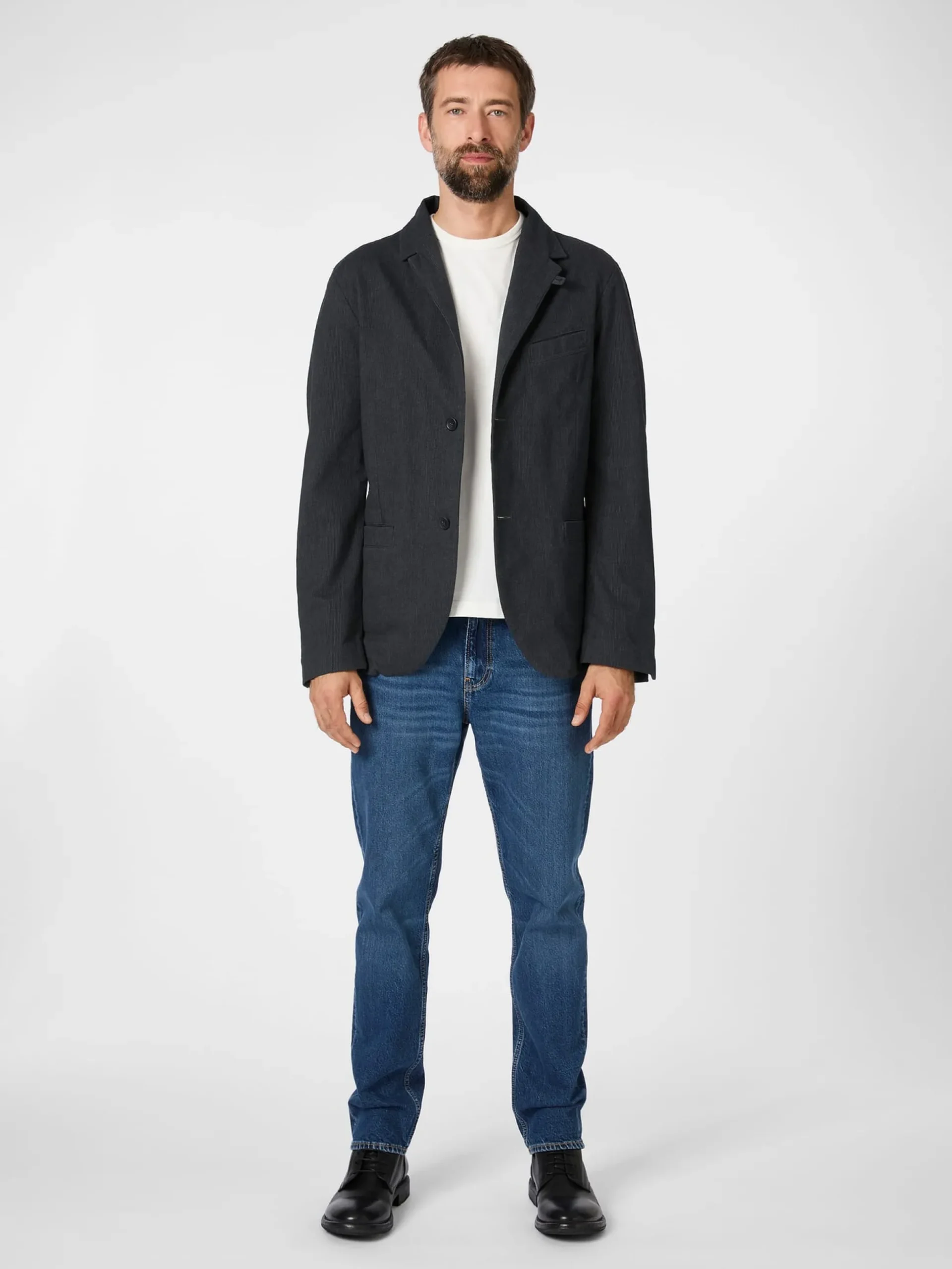 Dieses gerade geschnittene Sakko ist mit gerundeten Vorderteilen gearbeitet. Es hat ein Teilfutter, die sichtbaren Nähte sind innen sauber paspeliert. Abnäher im Vorderteil und Teilungsnähte im Rücken geben dem Sakko Form, eine markante Längsteilungsnaht im Rücken verschlankt und längt es optisch. Zwei Rückenschlitze erhöhen den Tragekomfort. Drei eingesetzte Taschen bieten Platz für Kleinteile des täglichen Bedarfs. Der weiche Baumwollstoff (mit etwas Elastananteil) zeigt ein feines Webmuster aus strukturierten Nadelstreifen.
