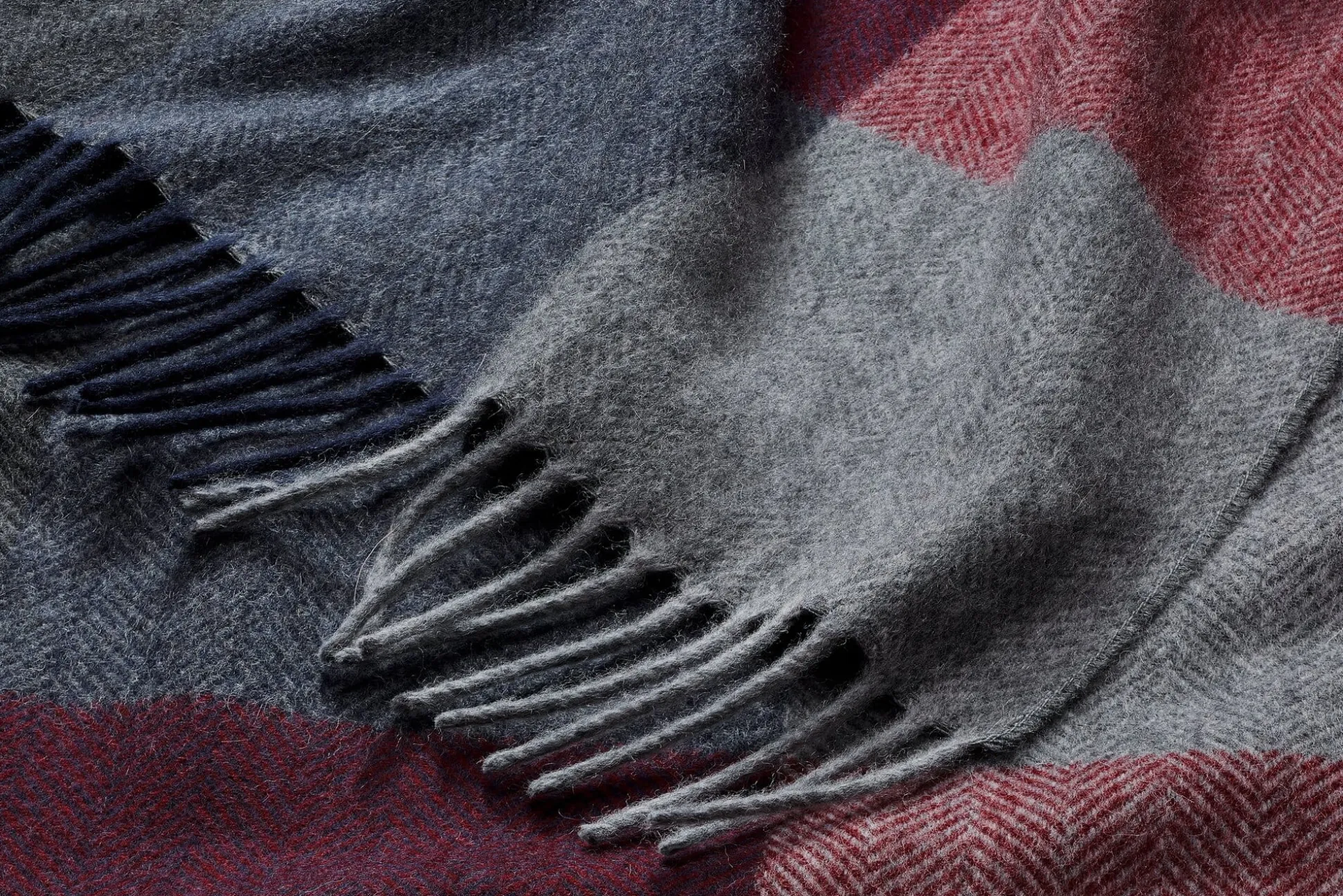 Wunderbar weicher Schal, der je zur Hälfte aus Kaschmir und Lammwolle besteht. Das feine Gewebe ist als Fischgrat ausgeführt und in unterschiedlich farbige Blöcke unterteilt. Fransenkanten bilden den Abschluss an den Enden des Schals.