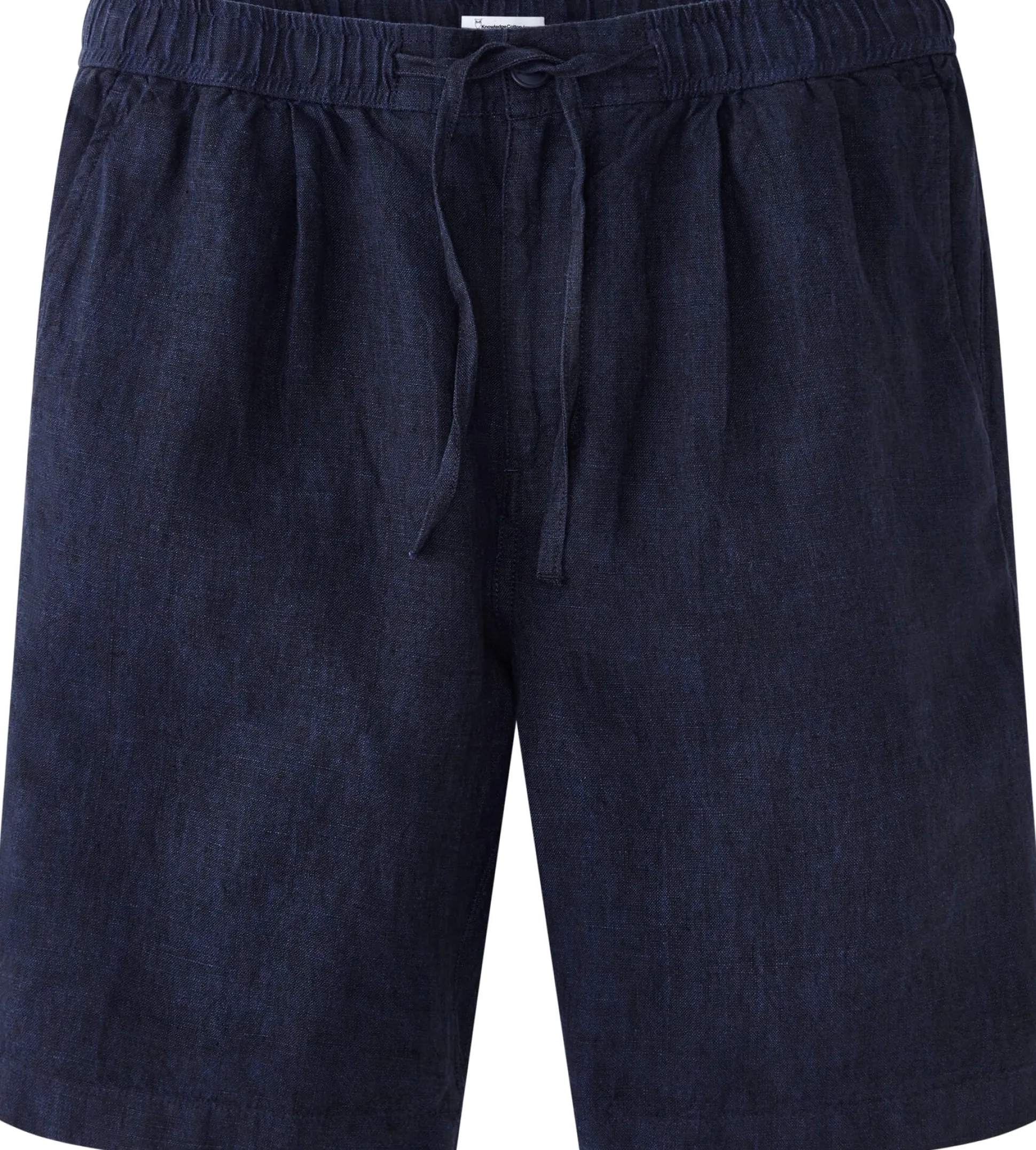 Lässige Shorts, deren Stoff aus strapazierbarem, kühlendem Leinen besteht. Das Gewebe zeigt die materialtypischem Fadenverdickungen und einen ausgeprägten Melangeeffekt. Die Shorts wird wird mittels Reißverschluss und Knopf geschlossen, ein Gummibund mit Bindeband im Tunnelzug erhöht den Tragekomfort. Je zwei Seitentaschen und eingesetzte Gesäßtaschen nehmen Kleinteile des täglichen Bedarfs auf. Die Flachsfasern für den Stoff stammen aus kontrolliert biologischem Anbau.