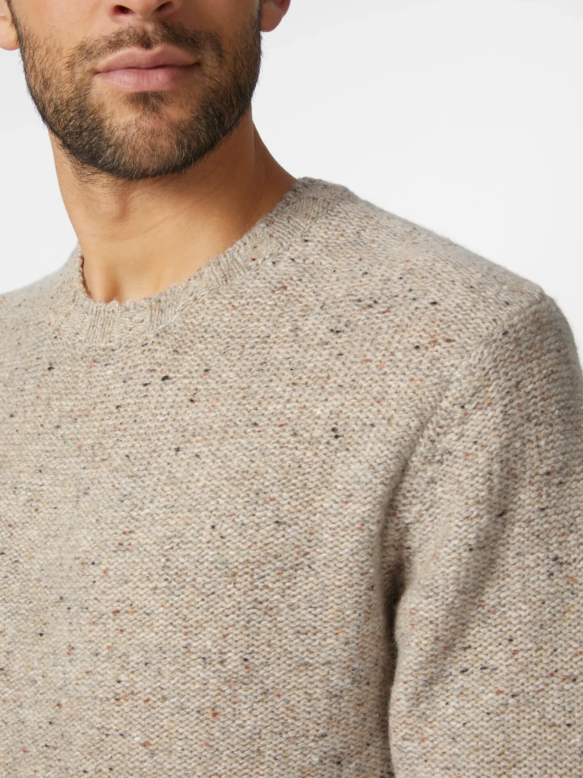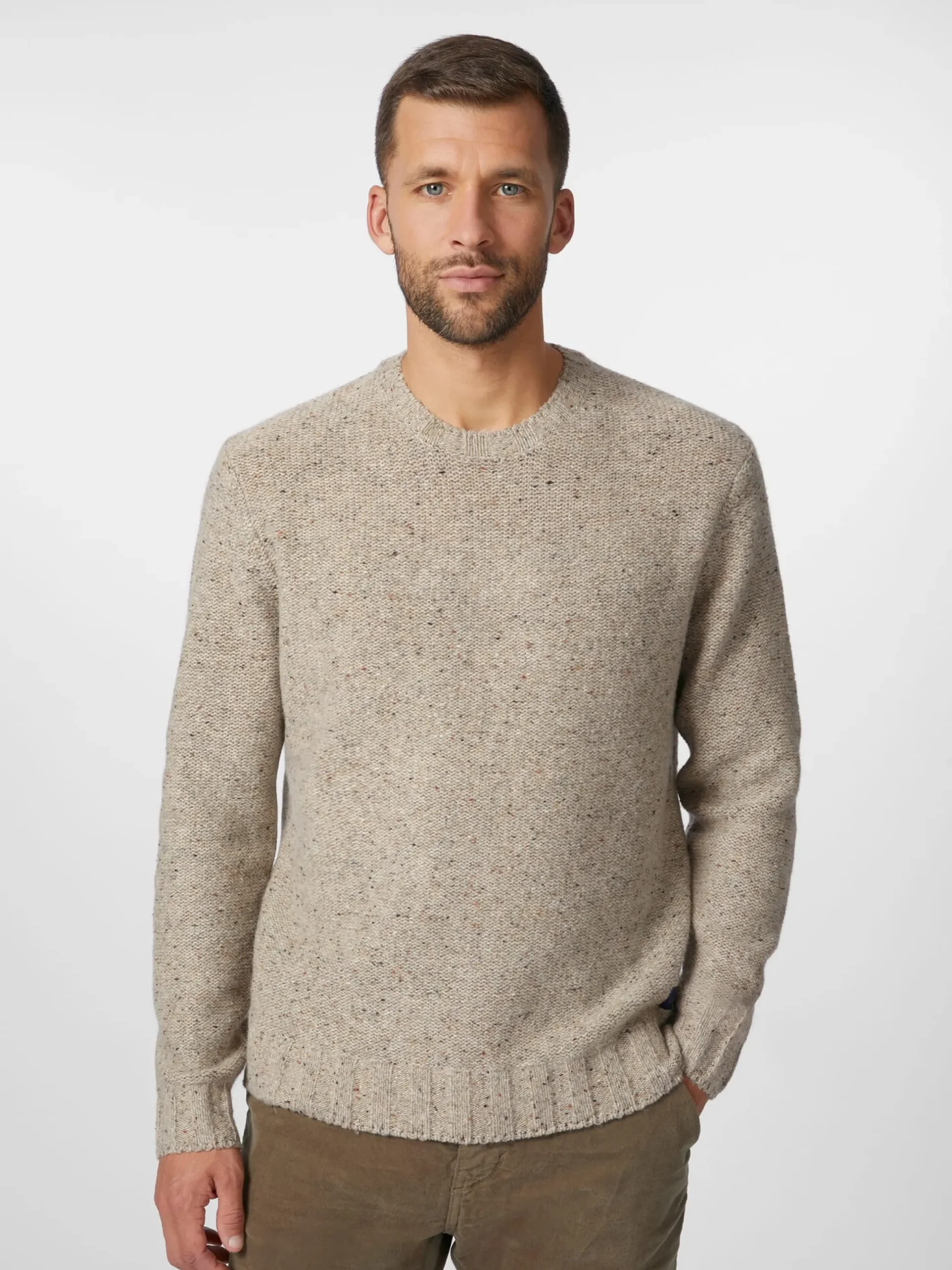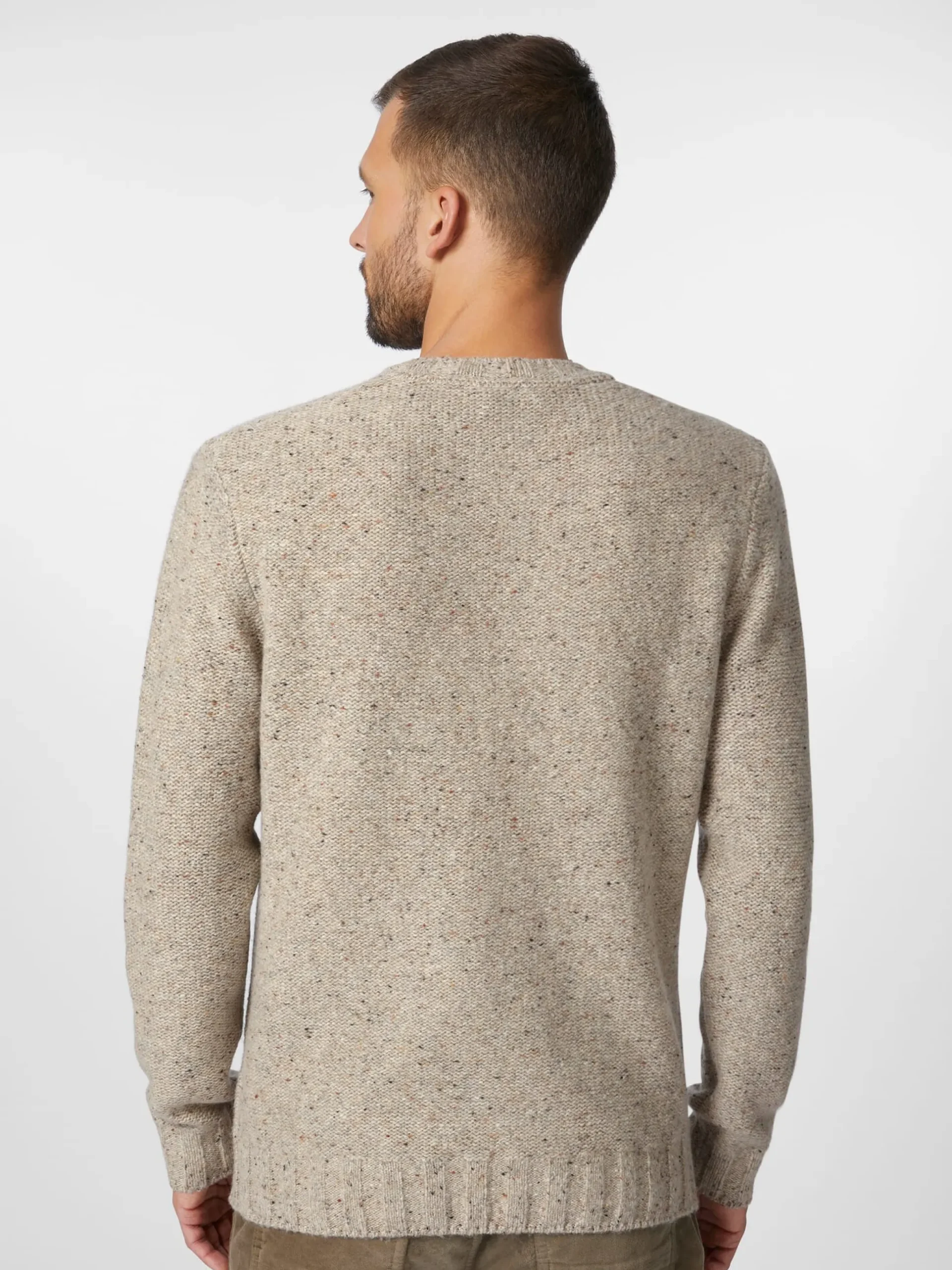 Das weiche und wärmende Gestrick dieses Pullovers zeigt nicht nur eine schöne Melangestruktur, sondern auch einen den „Donegal flecks“ ähnlichen Effekt. Er entsteht durch das feste Einarbeiten von farblich kontrastierenden Wollfasern in die Garne, was im Gestrick unregelmäßig verteilte Farbsprenkel erzeugt und ihm damit einen markanten Charakter gibt. Der Pullover ist linksgestrickt, die Bündchen an Hals, Ärmeln und Rumpf sind als breiter Rippenstrick ausgeführt. Die Garne bestehen zu 80 Prozent aus Wolle. Die restlichen 20 Prozent sind Recycling-Polyamid zugunsten der Haltbarkeit und Tragefreundlichkeit des Pullovers.